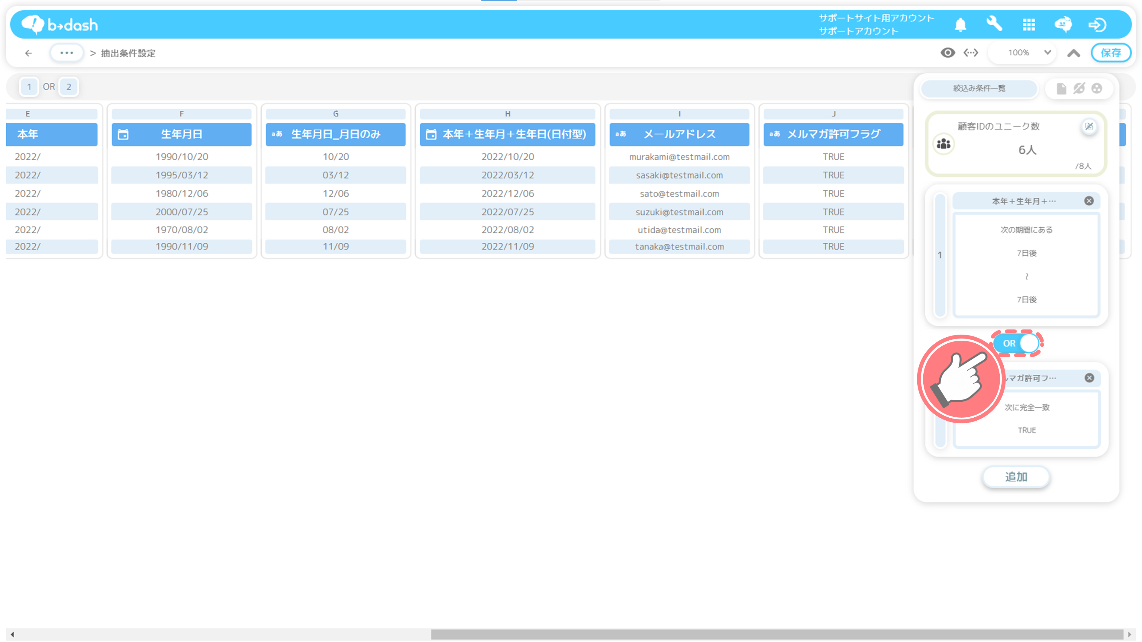 ※ただし、『個人情報の参照』の権限を『可』にした場合、b→dashで「個人情報設定」をしているすべてのデータを閲覧することができるようになりますので、ご注意ください
