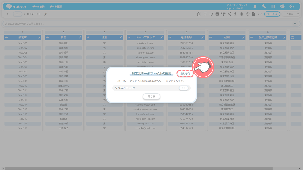 加工元データファイルを差し替えたデータファイル」をクリックします