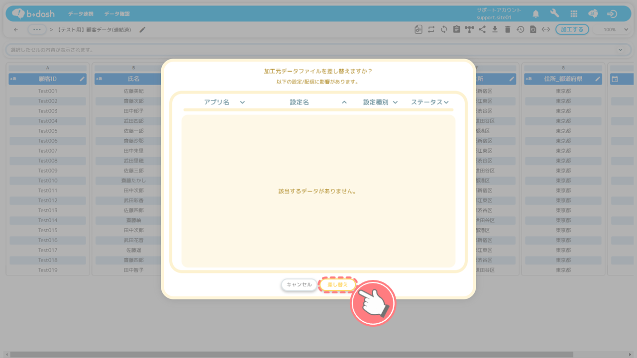 また、加工元データファイルを差し替える際に、加工元データファイルの確認やカラムの自動マッピング、後続の配信を停止することができます。