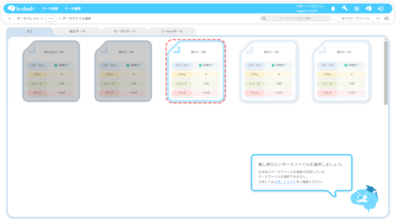 2023年10月11日のリリース後からは、加工したデータファイルの加工元データファイルを差し替えることができるようになりました。加工元データファイルを差し替えることで、データファイルに設定していた加工タスクや施策の設定を引き継ぐことができます。