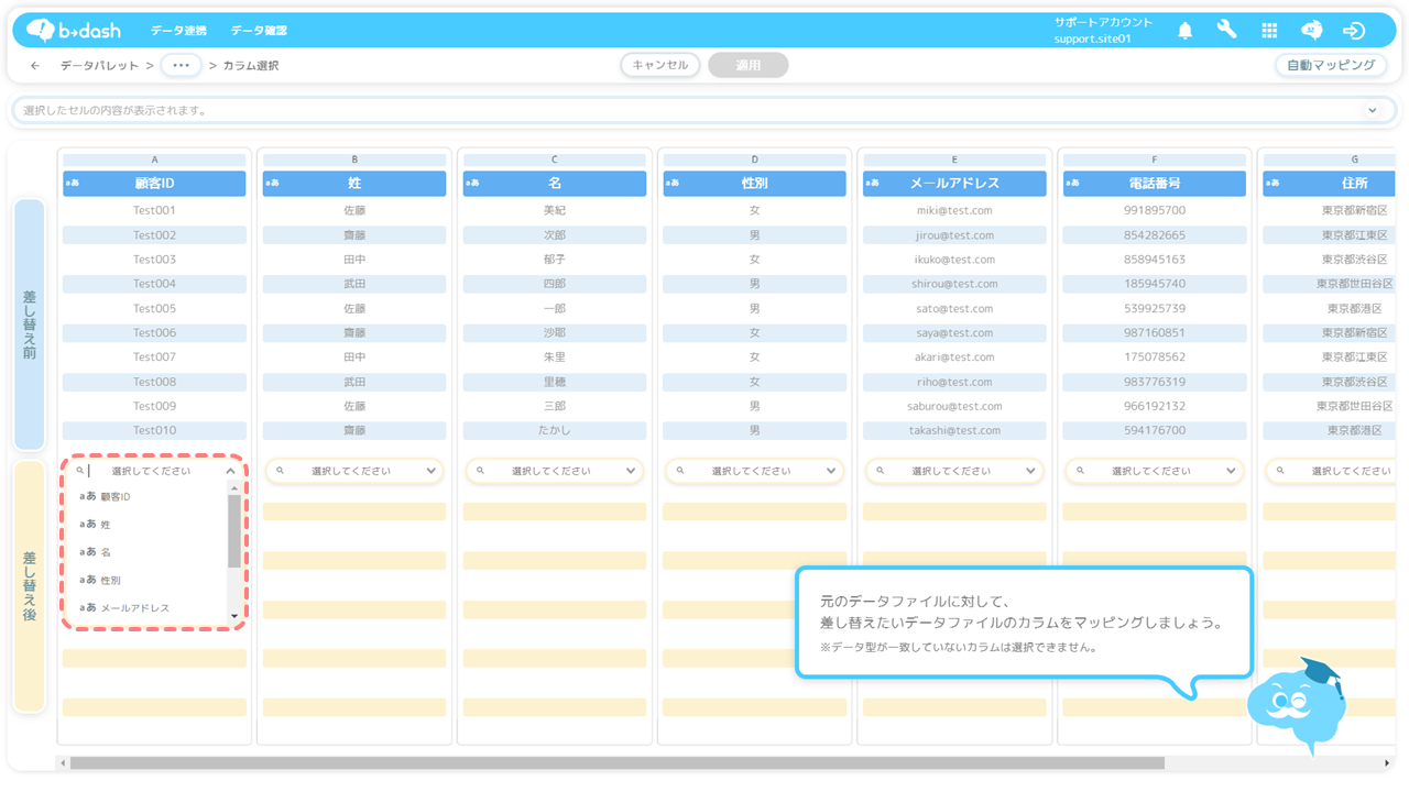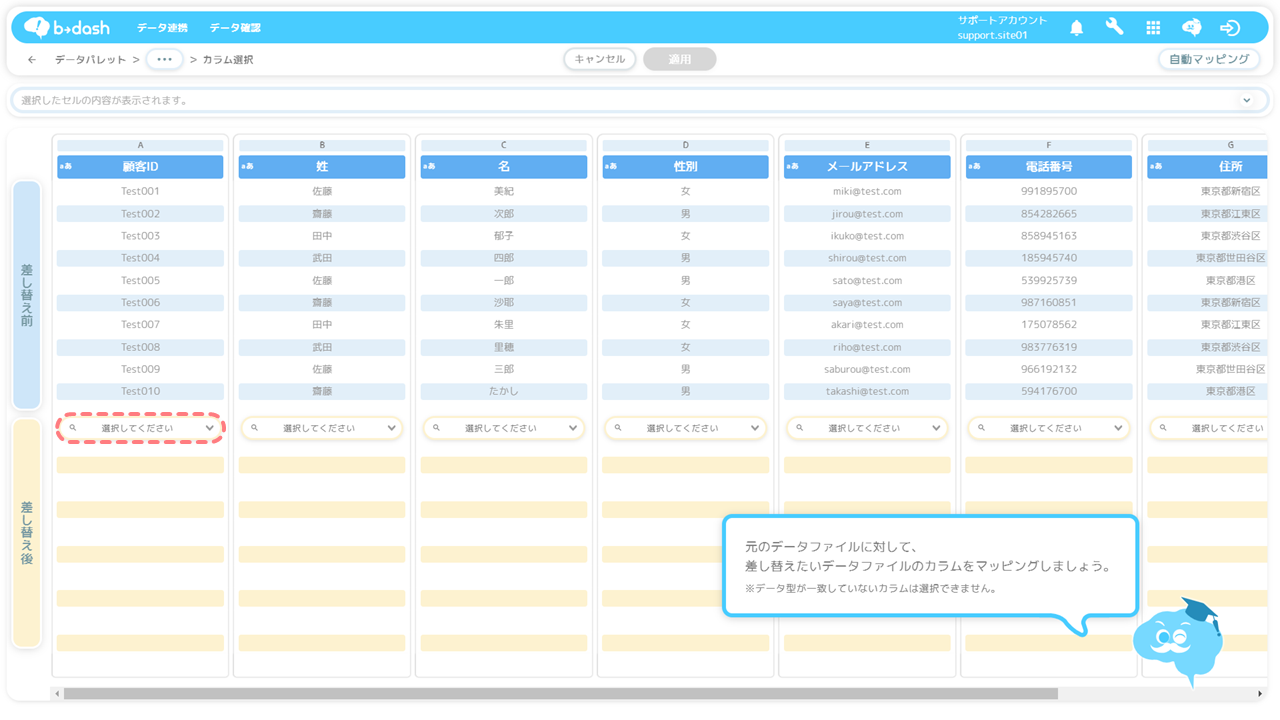 加工元データファイルの差し替え時には、差し替え後のデータファイルのカラムを自動でマッピングすることができます。ただしマッピングすることができるカラムは、差し替え前のデータファイルと差し替え後データファイルの「カラム名」「データ型」の両方が一致したもののみです