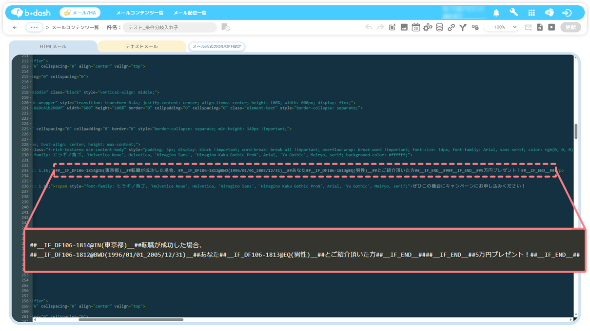 「HTMLメール」の「HTML編集モード」「テキストメール」にて、「条件分岐」を『入れ子構造』で設定することができるようになります。