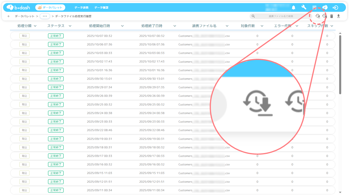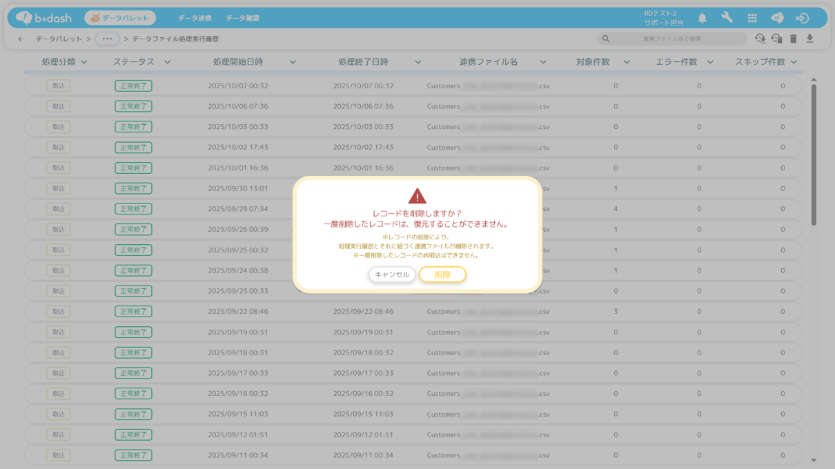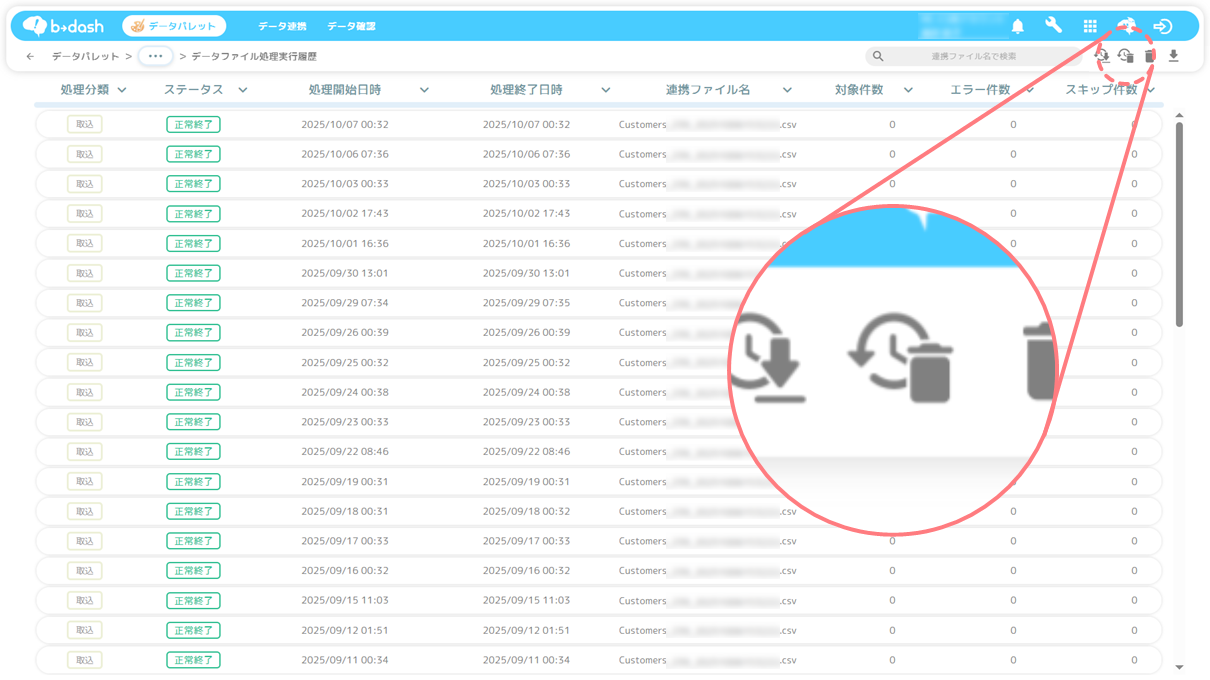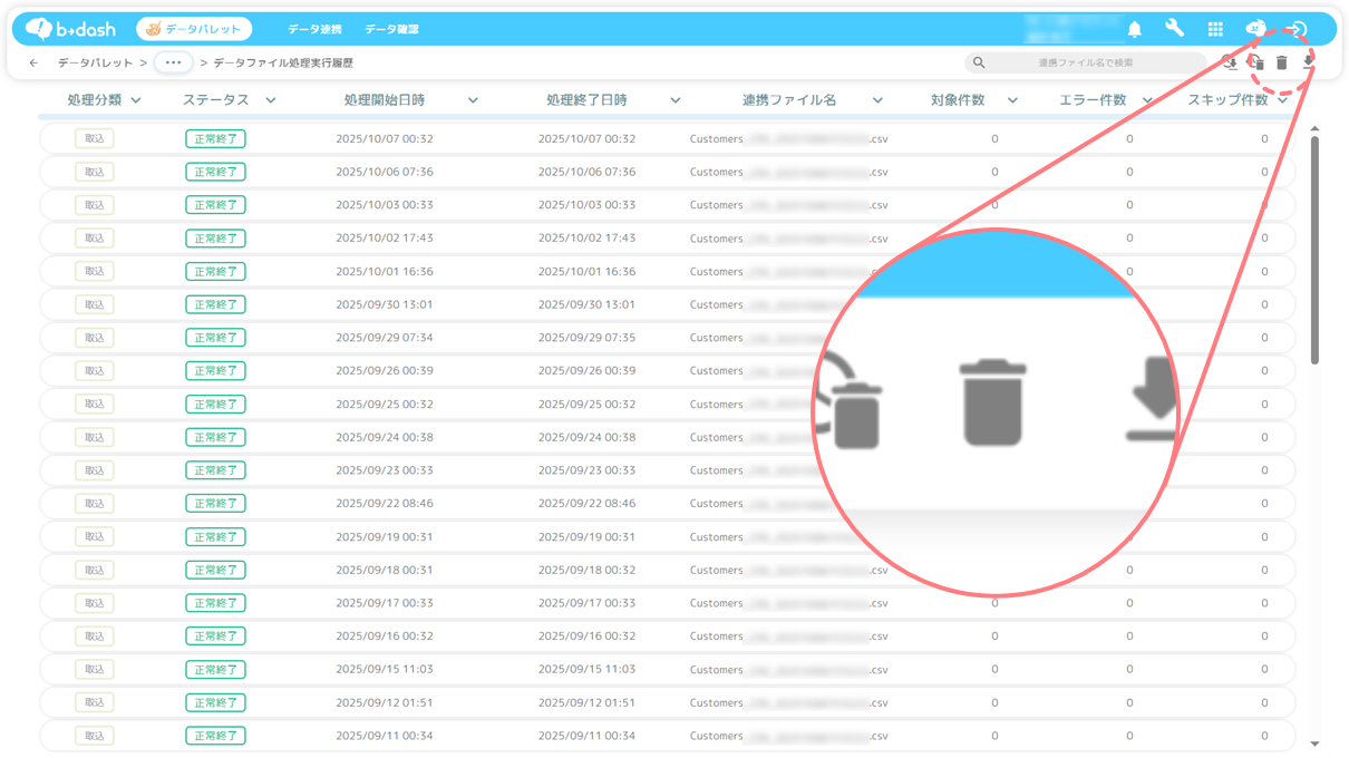 データパレット|「処理実行履歴画面」で取り込み元データを削除できる
