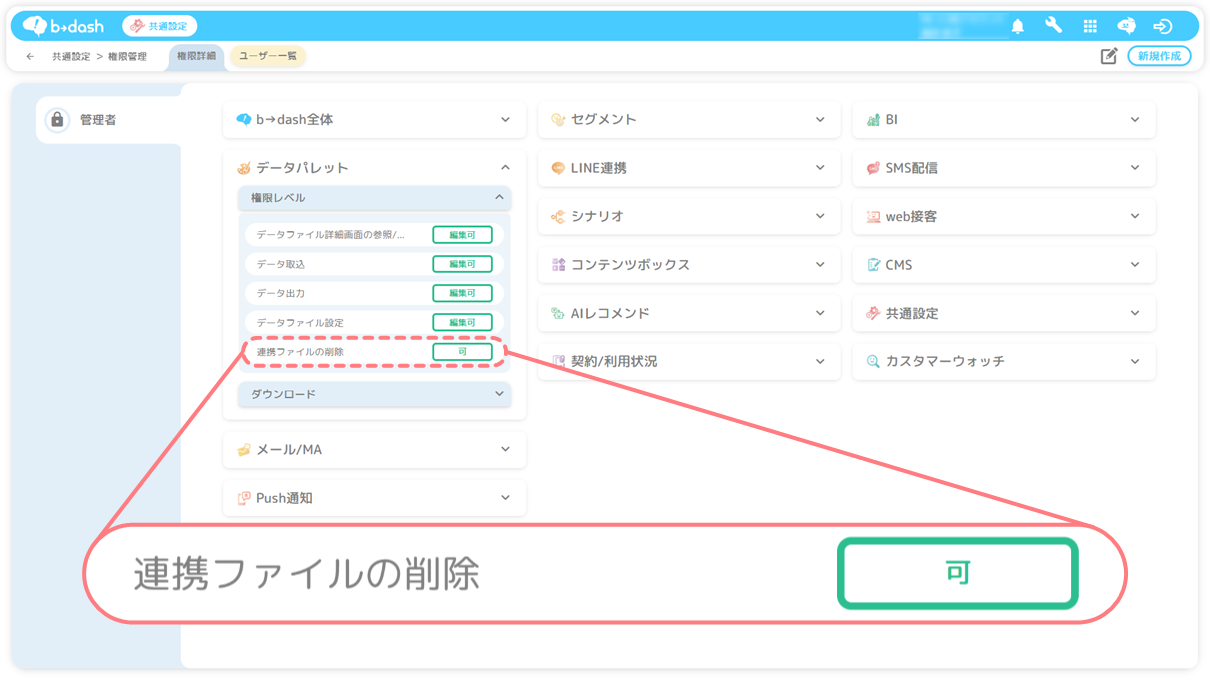 「権限レベル」を「可」に設定することで、任意の取り込み元データ(連携ファイル)を削除できるようになります。