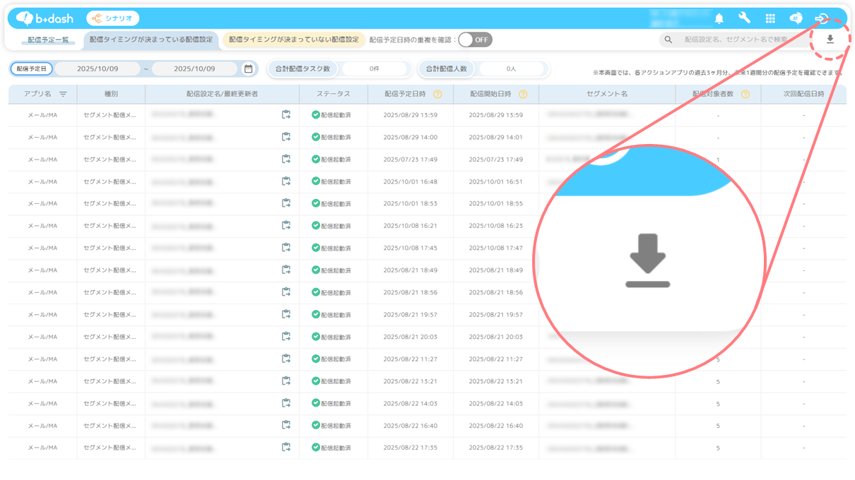 『CSVダウンロード』したい場合は、「配信予定一覧画面」で「ダウンロードアイコン」をクリックしてください。