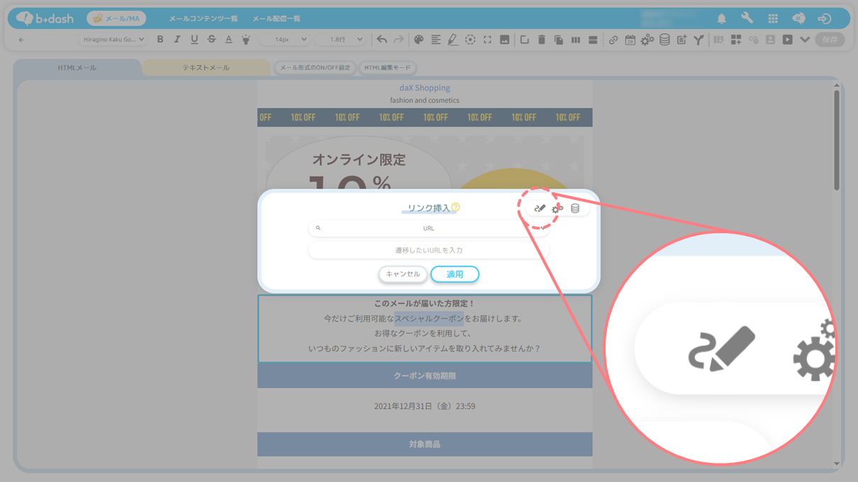 新たに追加された『設定名挿入アイコン』をクリックすると、URLに「コンテンツ名」や「配信設定ID」を挿入できるようになります。