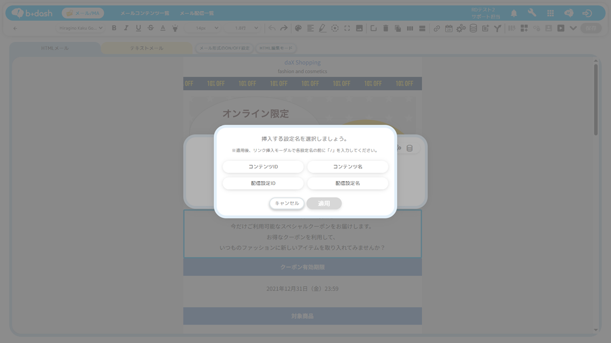 テスト送信や本番配信時には、実際の名称やIDが差し込まれた状態で配信されます。
