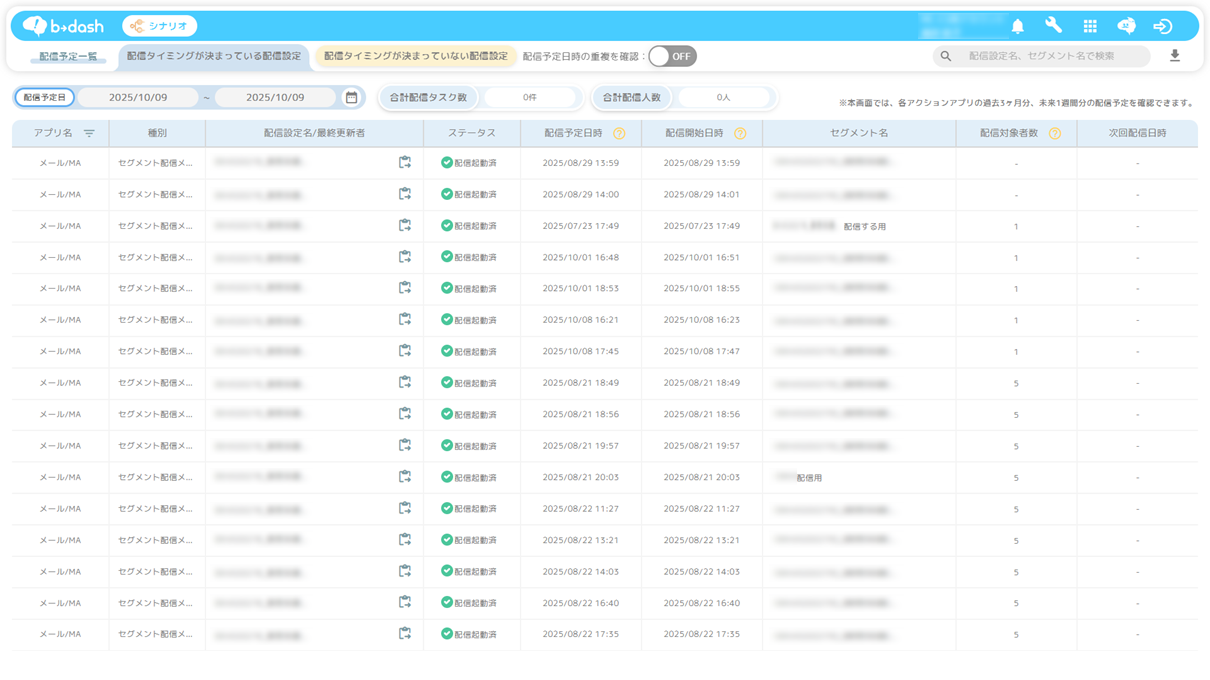 ・配信日時や配信状況は、配信設定ごとにしか確認できないため、配信予定の全量や配信が完了しているのかを確認する手間がかかる。