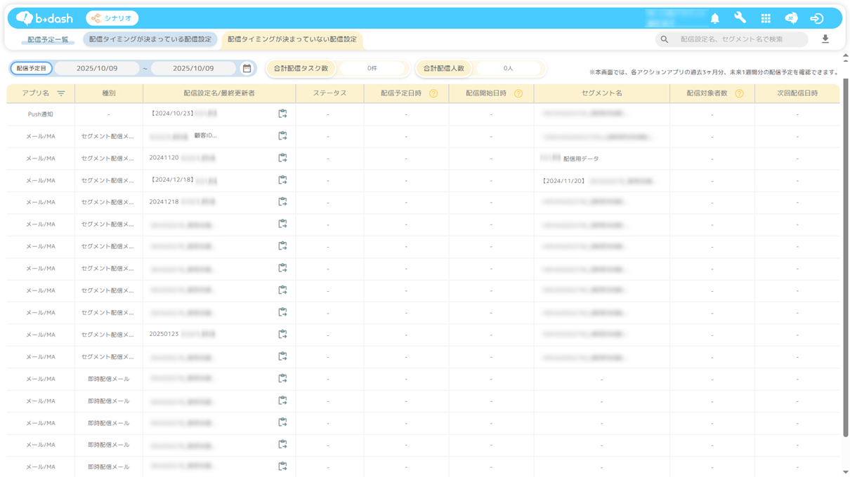 また「配信予定一覧画面」では、『配信タイミングが決まっている配信設定』と『配信タイミングが決まっていない配信設定』がタブで分かれて表示されます。