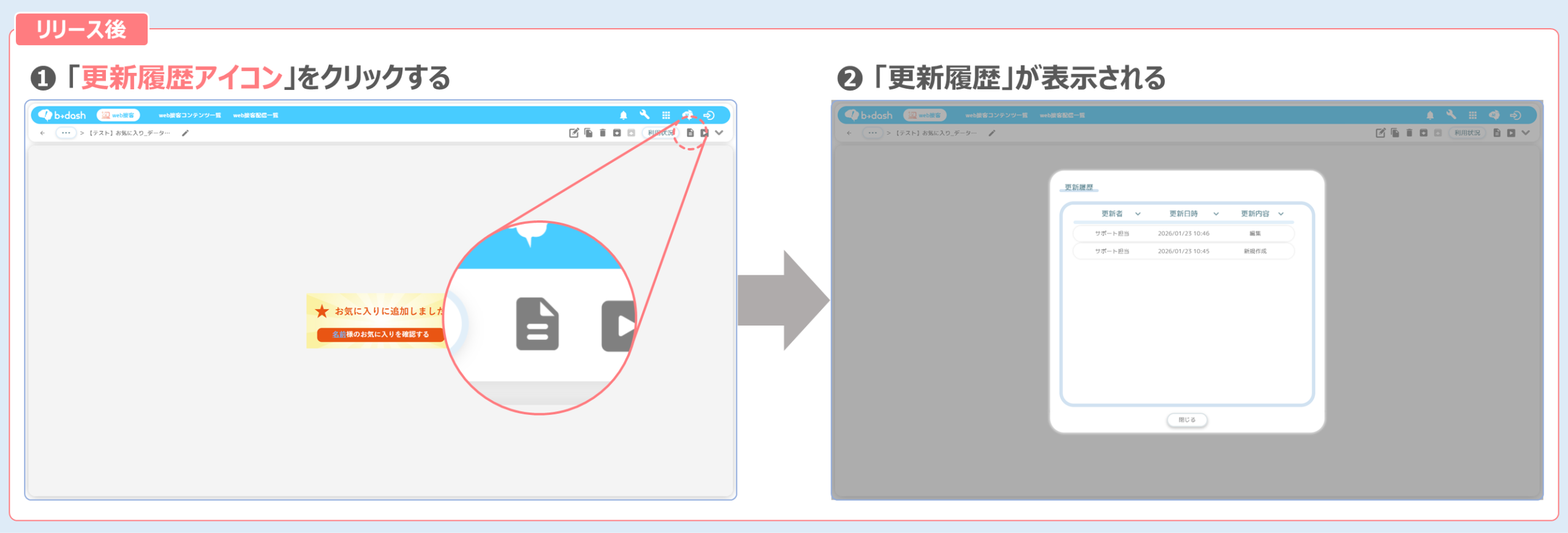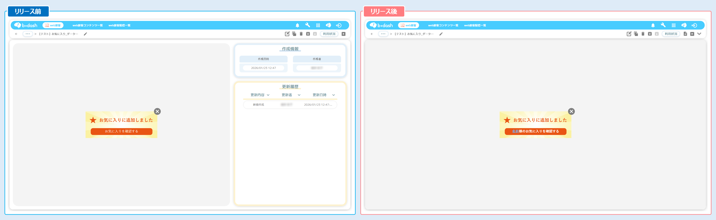 リリース前とリリース後のweb接客コンテンツ詳細画面リリース後の更新履歴確認手順