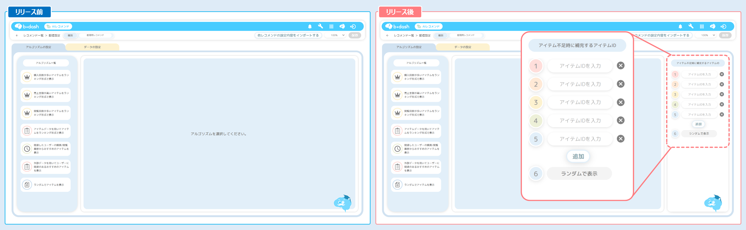 配信設定作成画面の「アルゴリズムの設定タブ」に、新たに『アイテム不足時に補完するアイテムID』が追加されます。