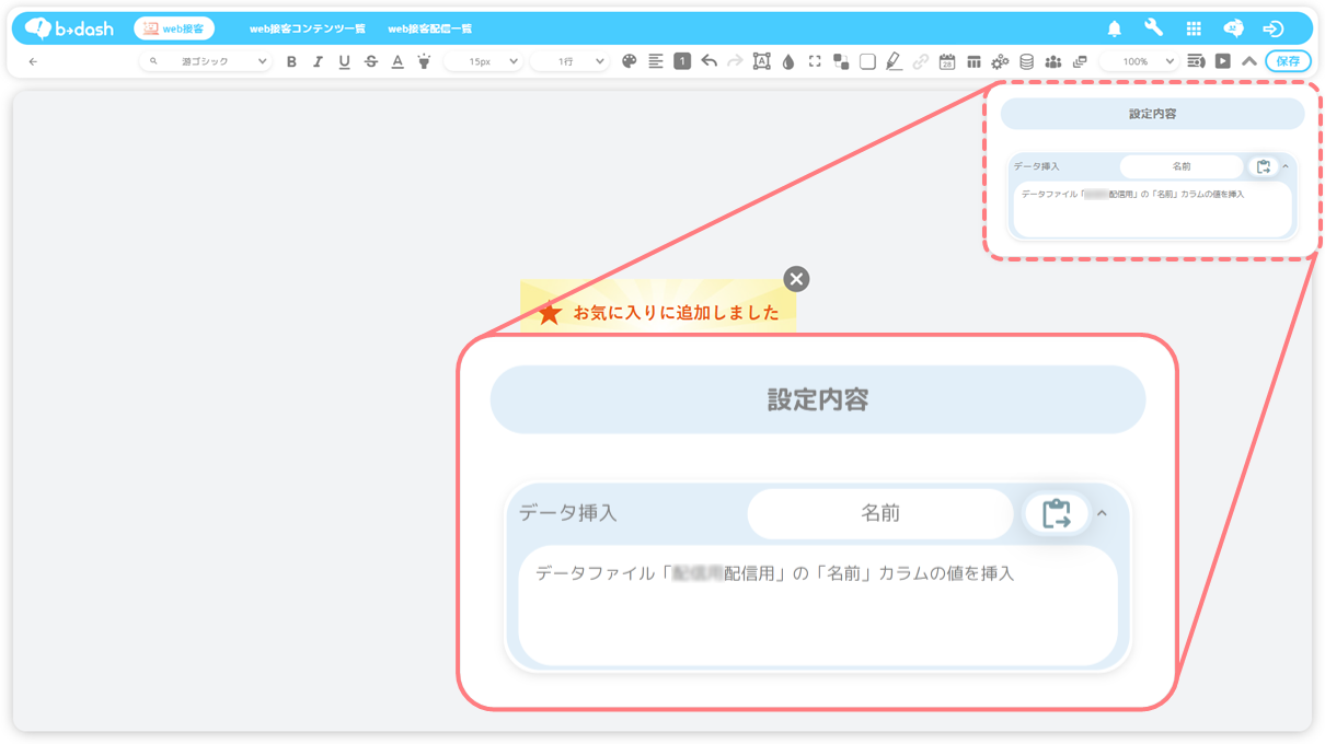 [参考:(左)web接客のコンテンツ編集画面の『設定内容アイコン』/(右)『データ挿入』している場合の設定内容]