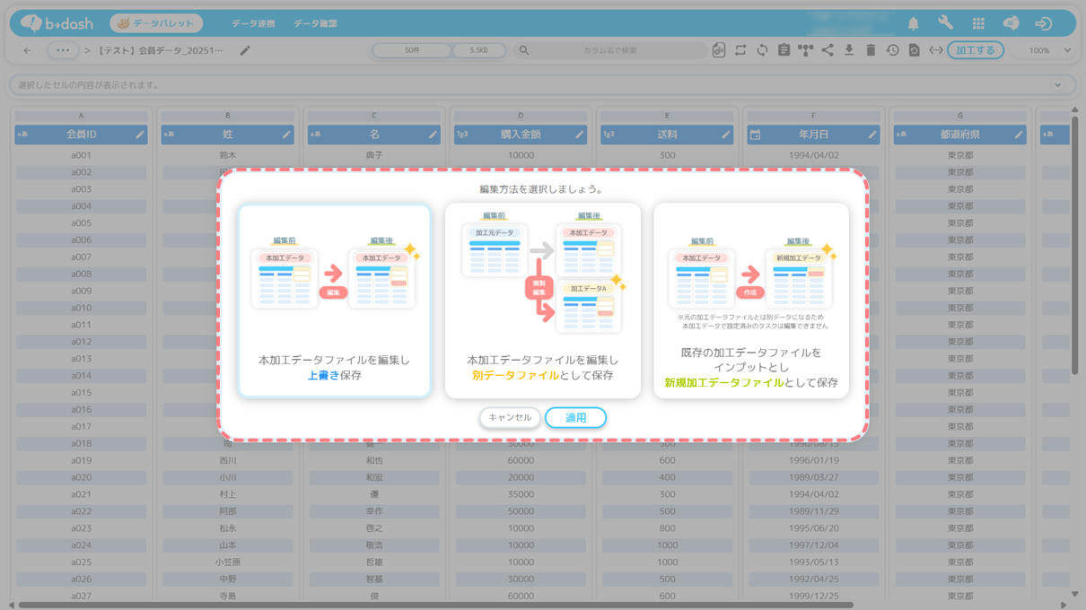 データの編集方法」を選択し、「適用」をクリックします
