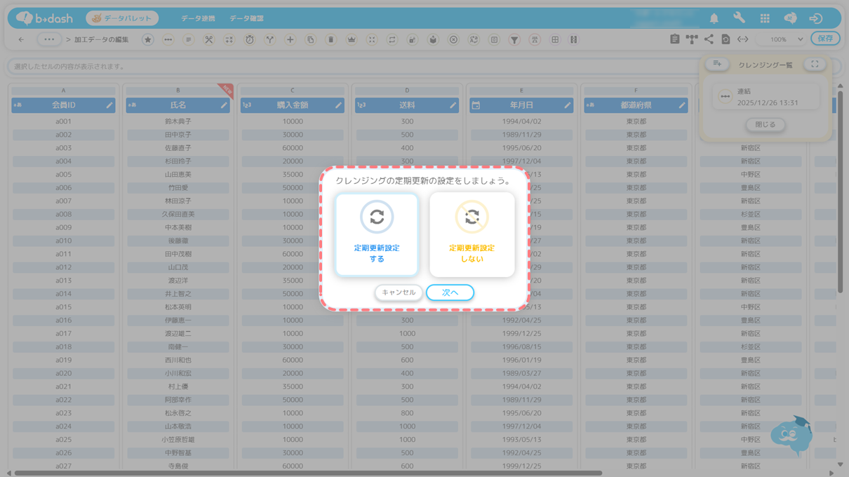 • 「更新設定をする」を選択した場合は、参照しているデータファイルの更新、または設定時間のタイミングでクレンジング処理が自動で実行されます