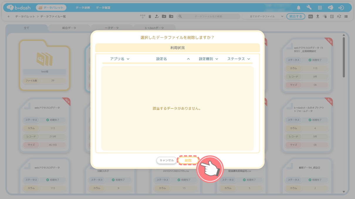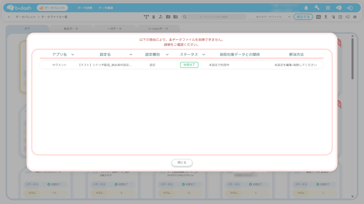 データファイルを削除したい場合、そのデータファイルを利用している各アプリの配信設定や、セグメントを削除してください!