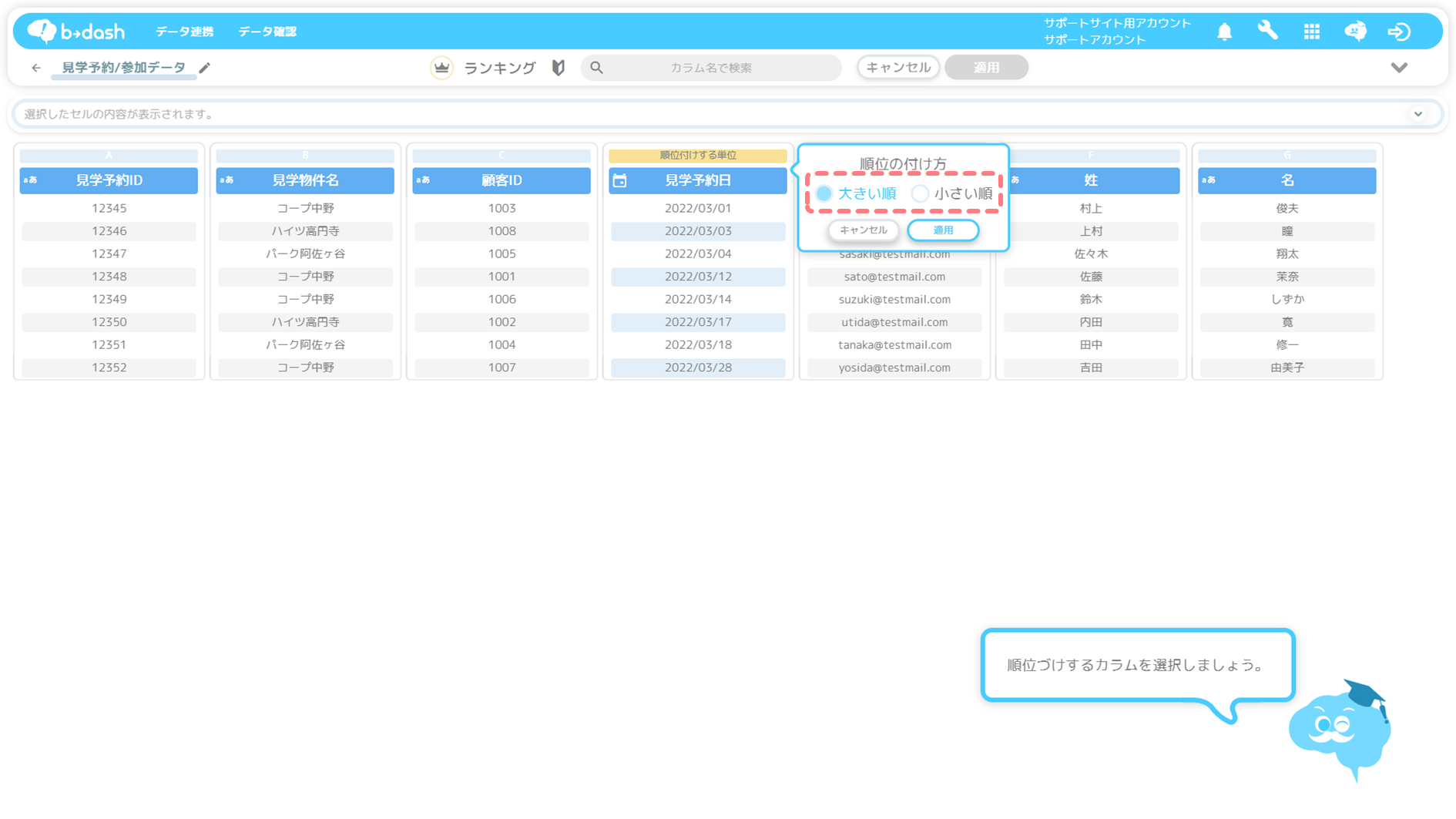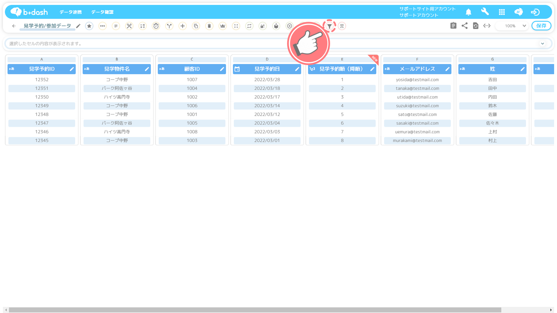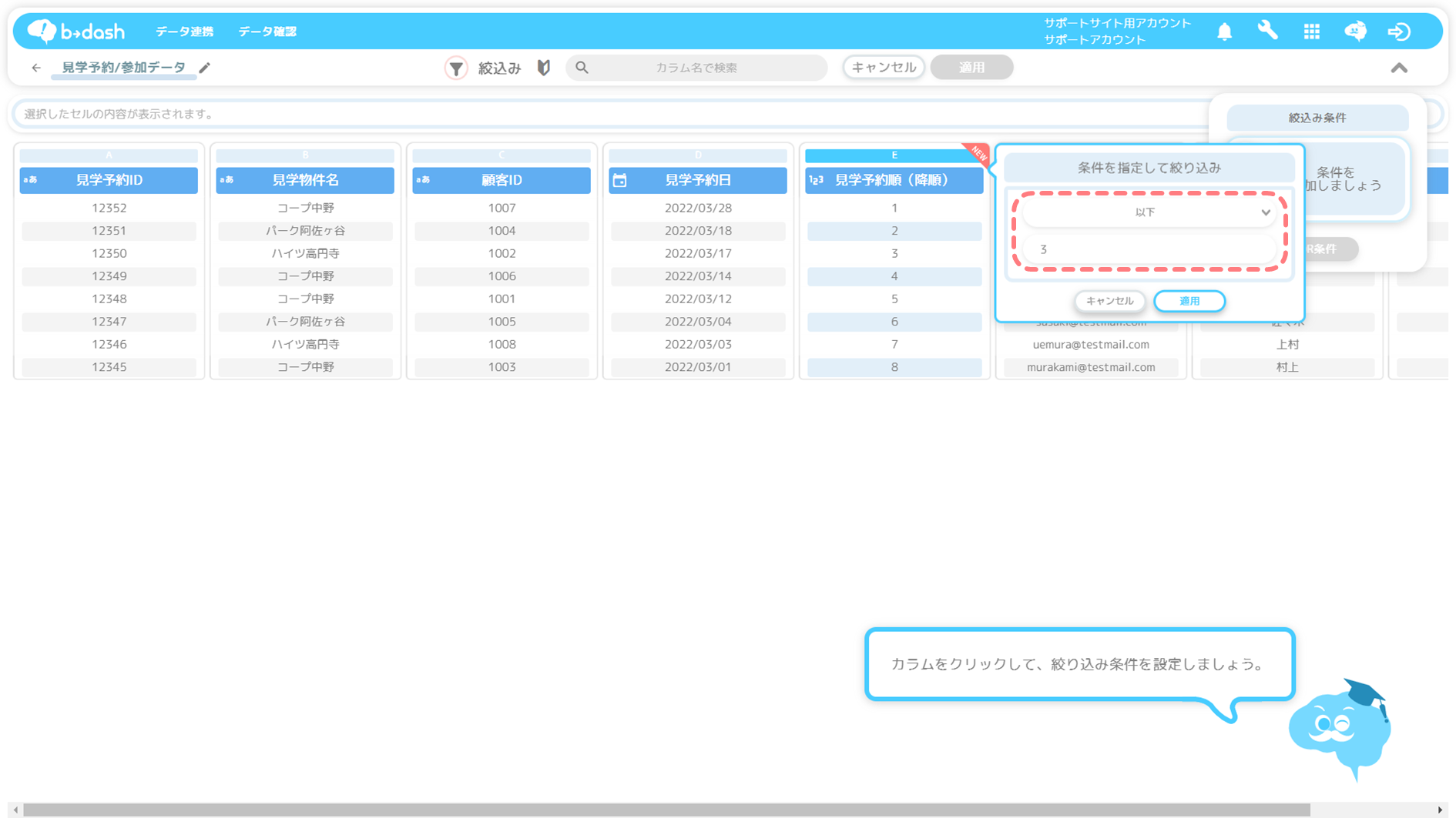 下記では、見学予約/参加データの見学予約日カラムをもとに降順に並び替え、最も新しい日時の3レコード分(顧客3名分のデータ)を抽出する手順について紹介します。