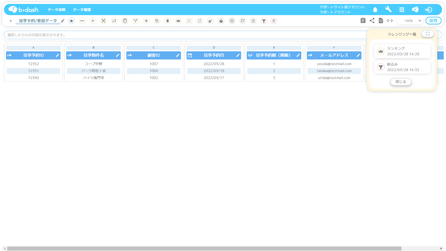 b→dash上のデータの全体のレコード数が、貴社が保有する連携元のデータのレコード数と「一致」していれば、データの構築が正しく行われています。