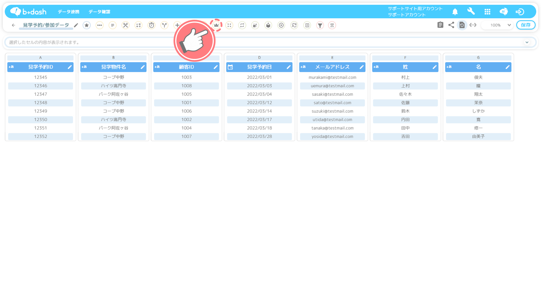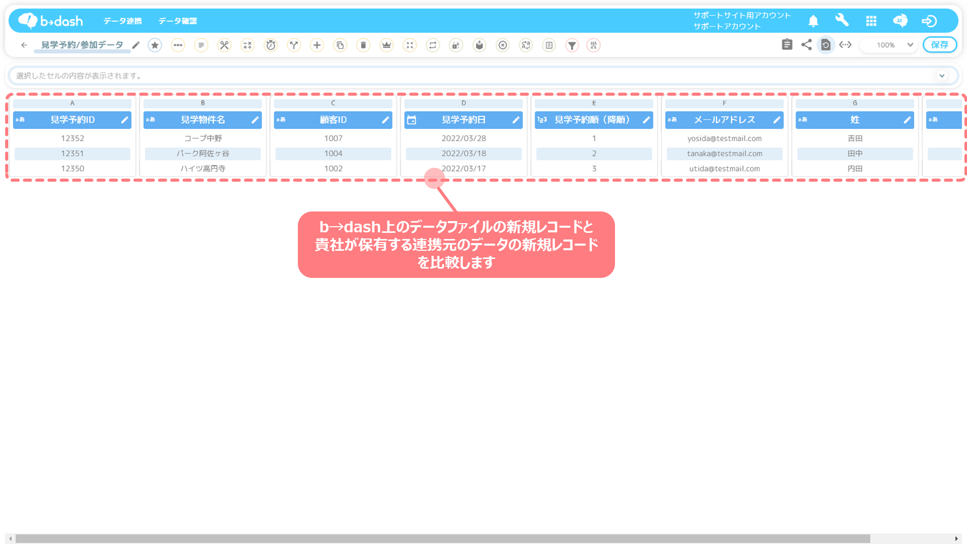 b→dash上の見学予約/参加データ(2次データ)新規レコードが、貴社が保有する連携元のデータの新規レコードと内容が一致しているかを確認します。