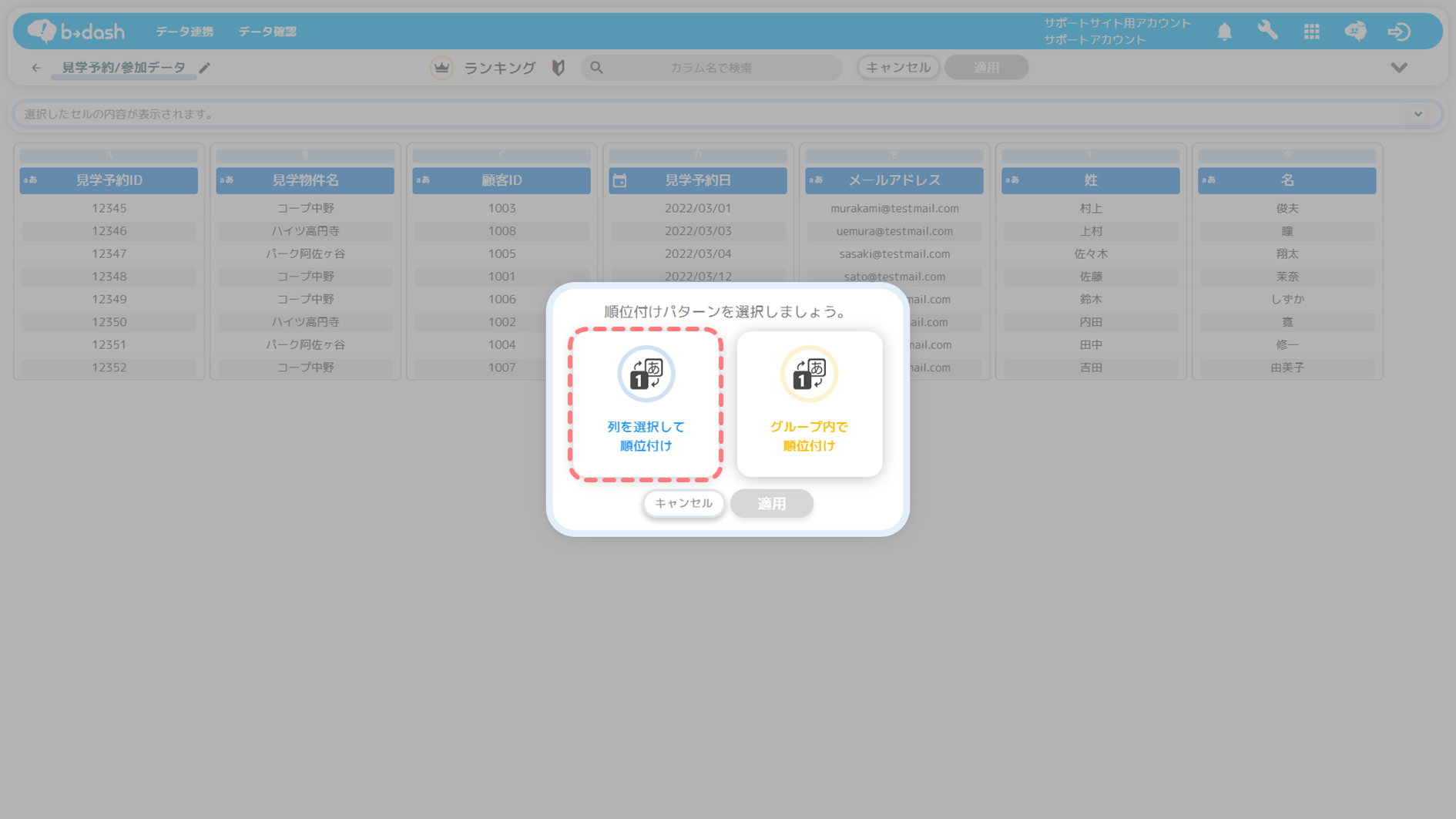 「列を選択して順位付け」を選択し、「適用」をクリックします