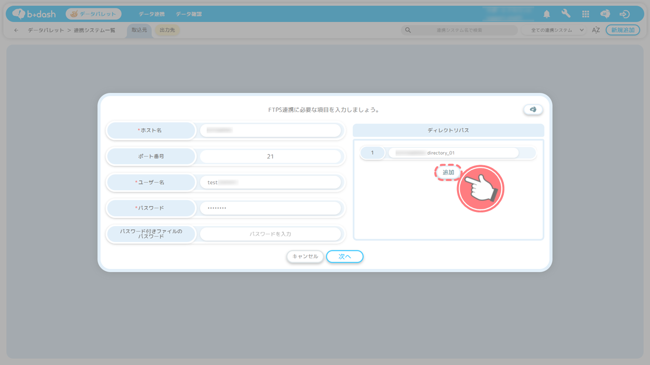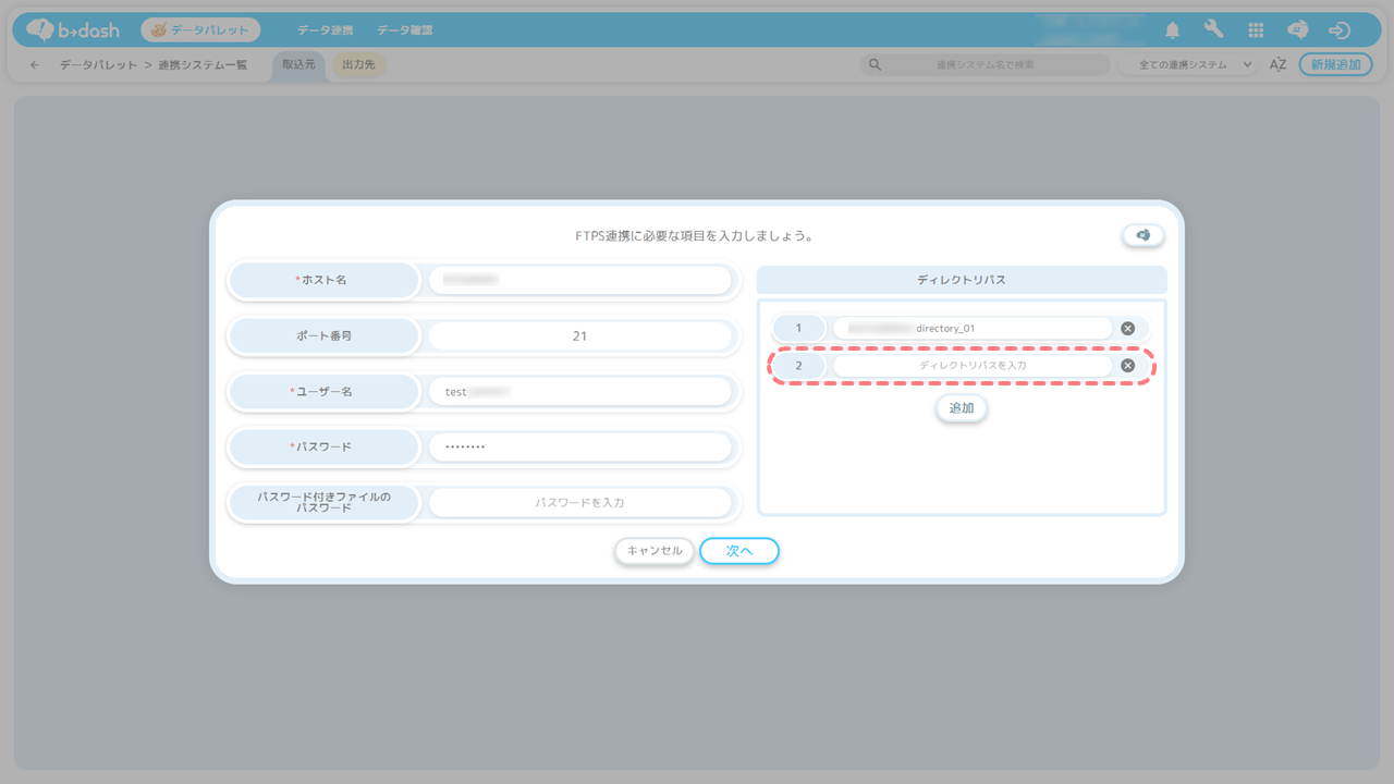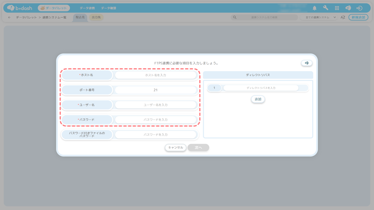 「b→dashが貴社のサーバーへデータを取りに行くパターン」では、接続情報として「ホスト名」「ユーザー名」「パスワード」を事前に準備する必要があります。
