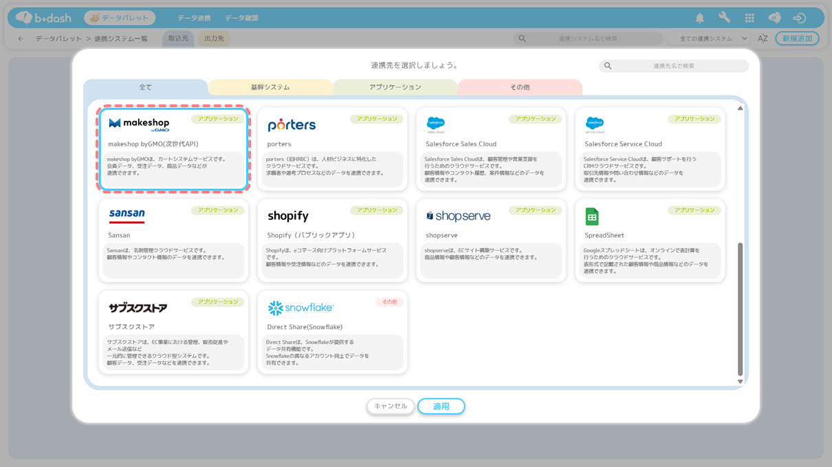 「makeshop」で管理している会員データや、受注データ、商品データの情報などをb→dashに連携したい場合は、本記事をご参照ください。