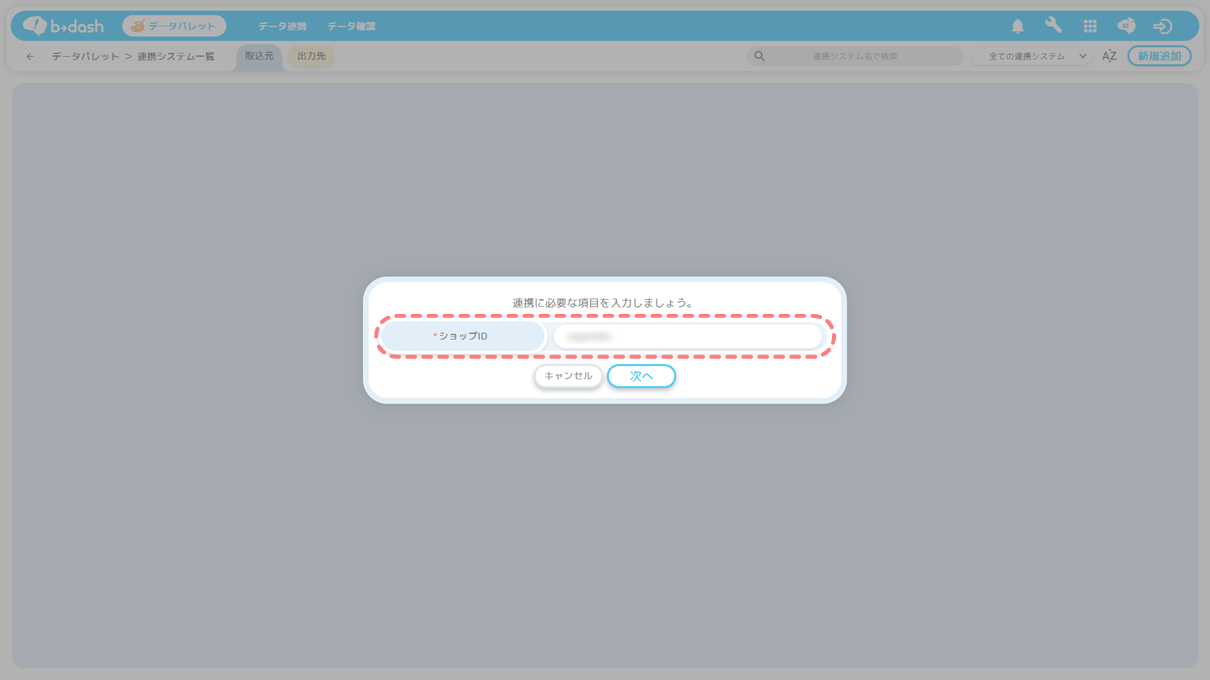 連携に必要な情報(ショップID)を入力し、「次へ」をクリックします