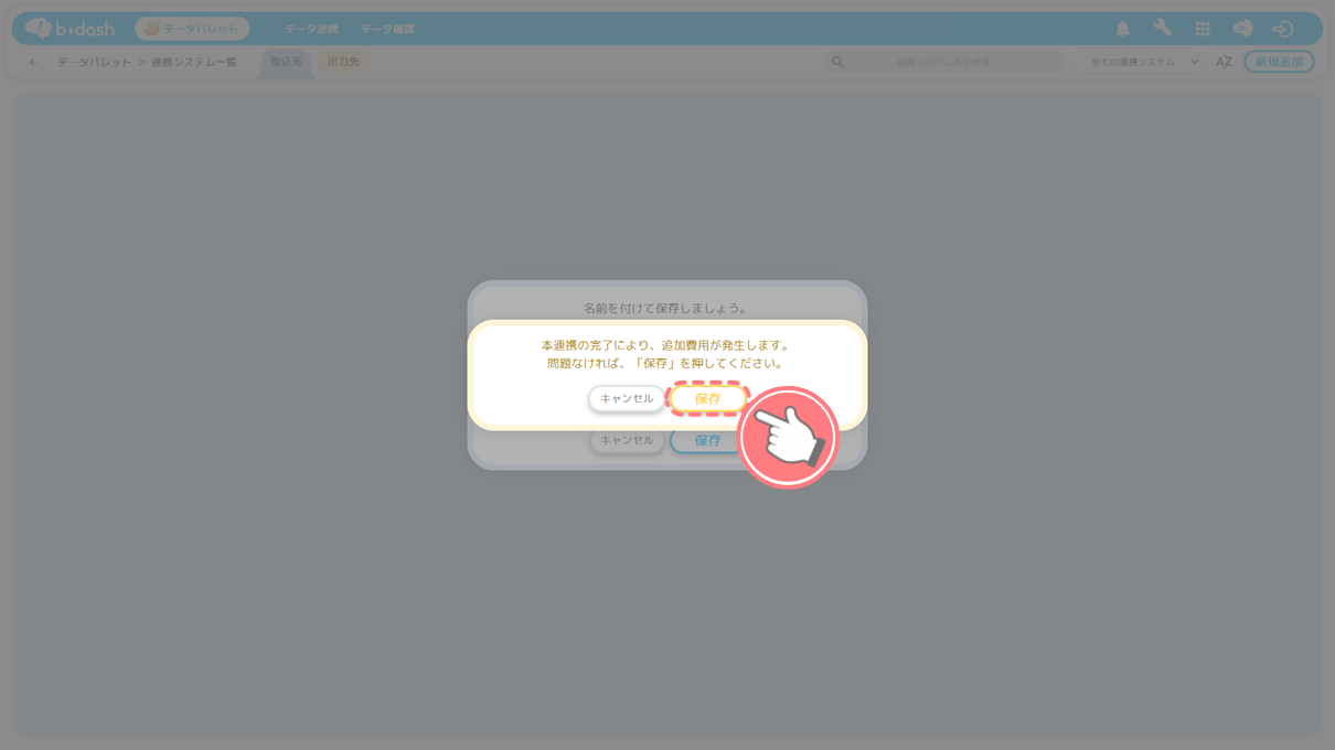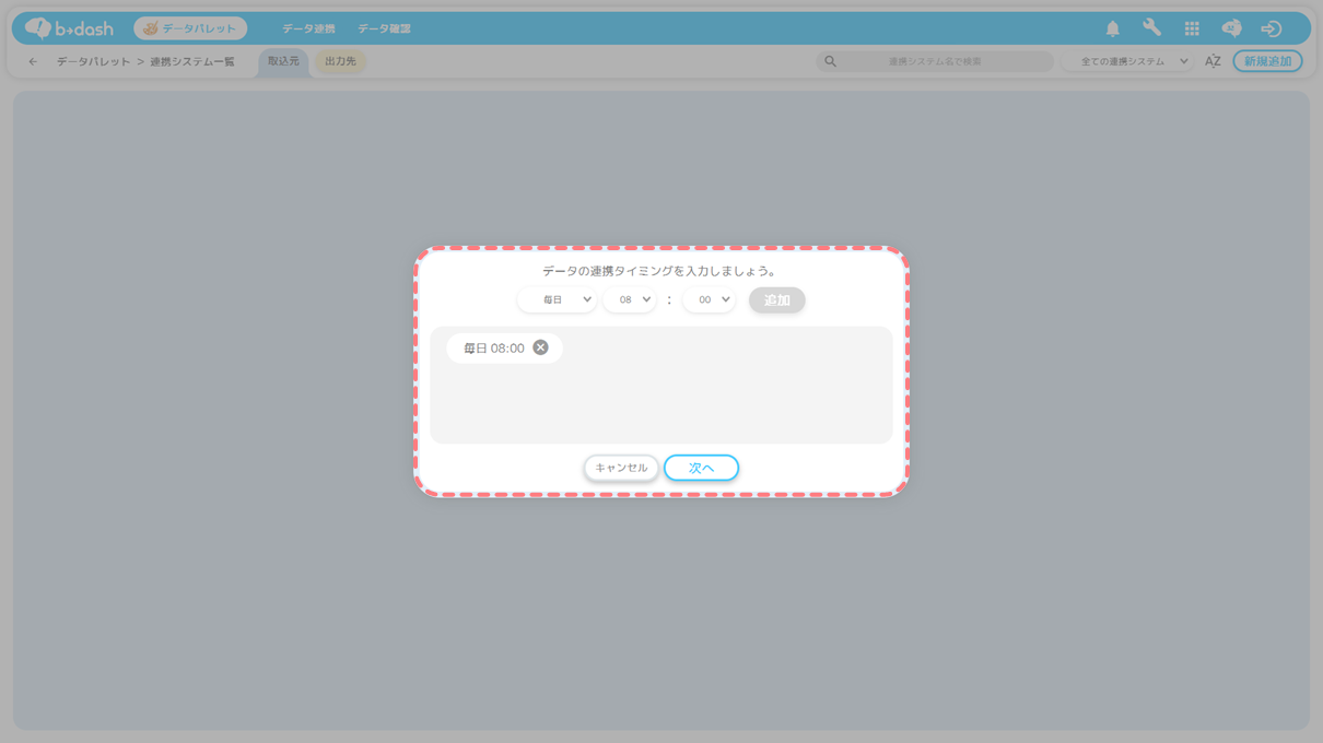 b→dashに入力した連携タイミングの時間になると「連携処理」が開始されます