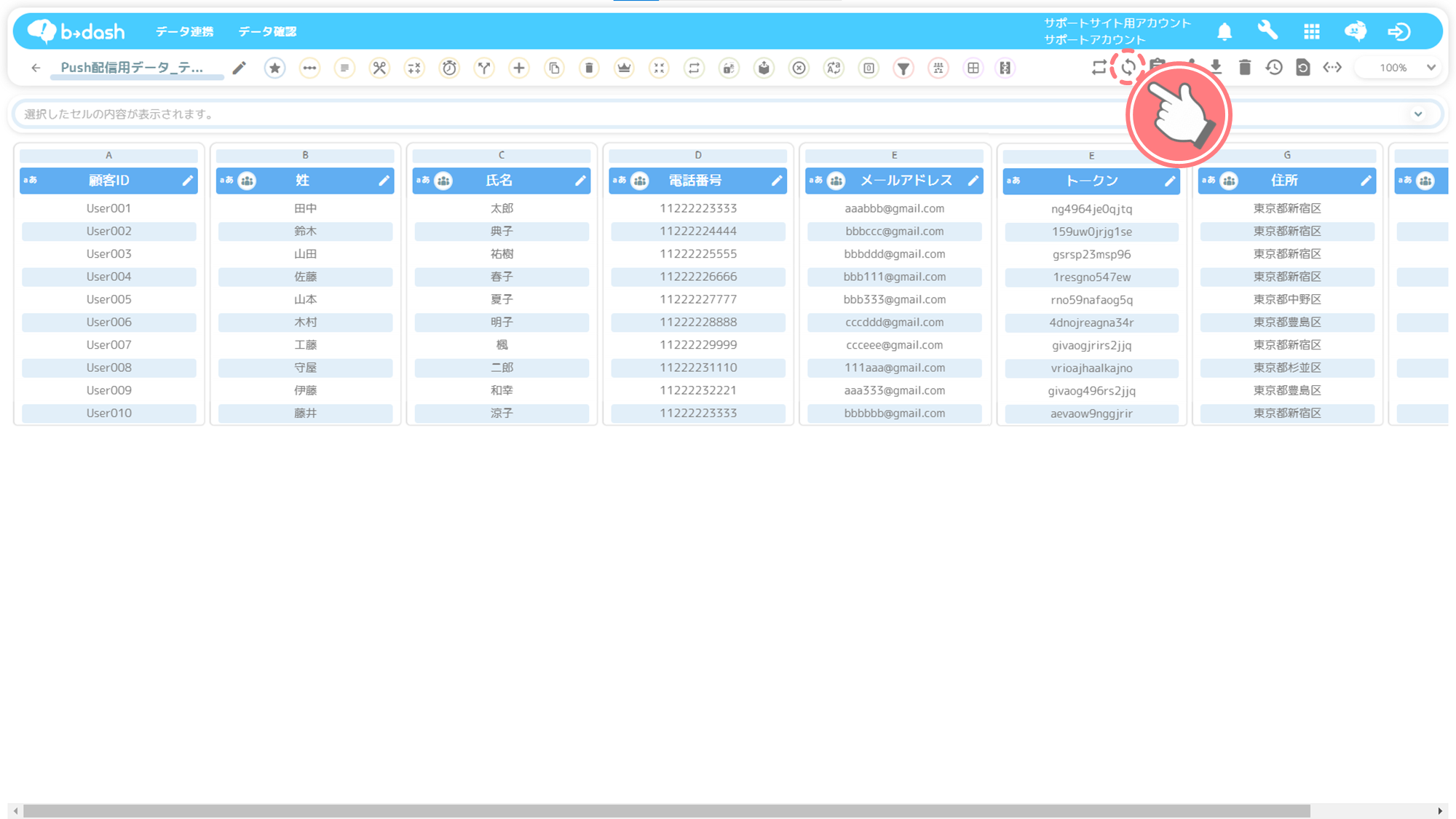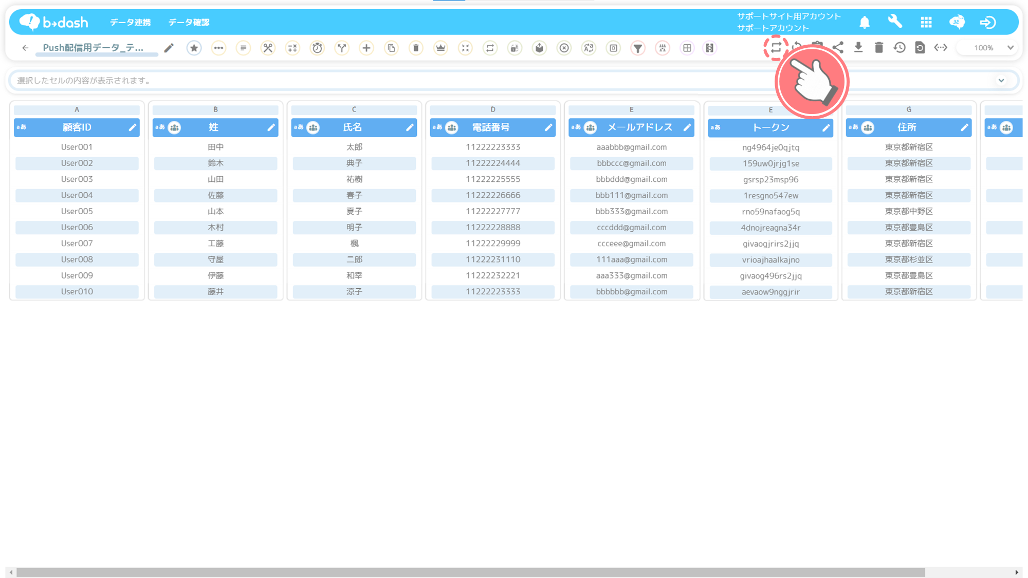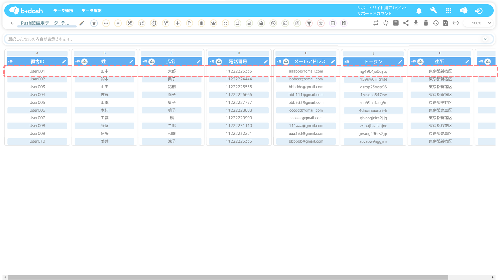 データ挿入」に使用しているデータファイルを開き、「テストデータ挿入」の設定時に指定した「顧客ID」が存在するか確認します