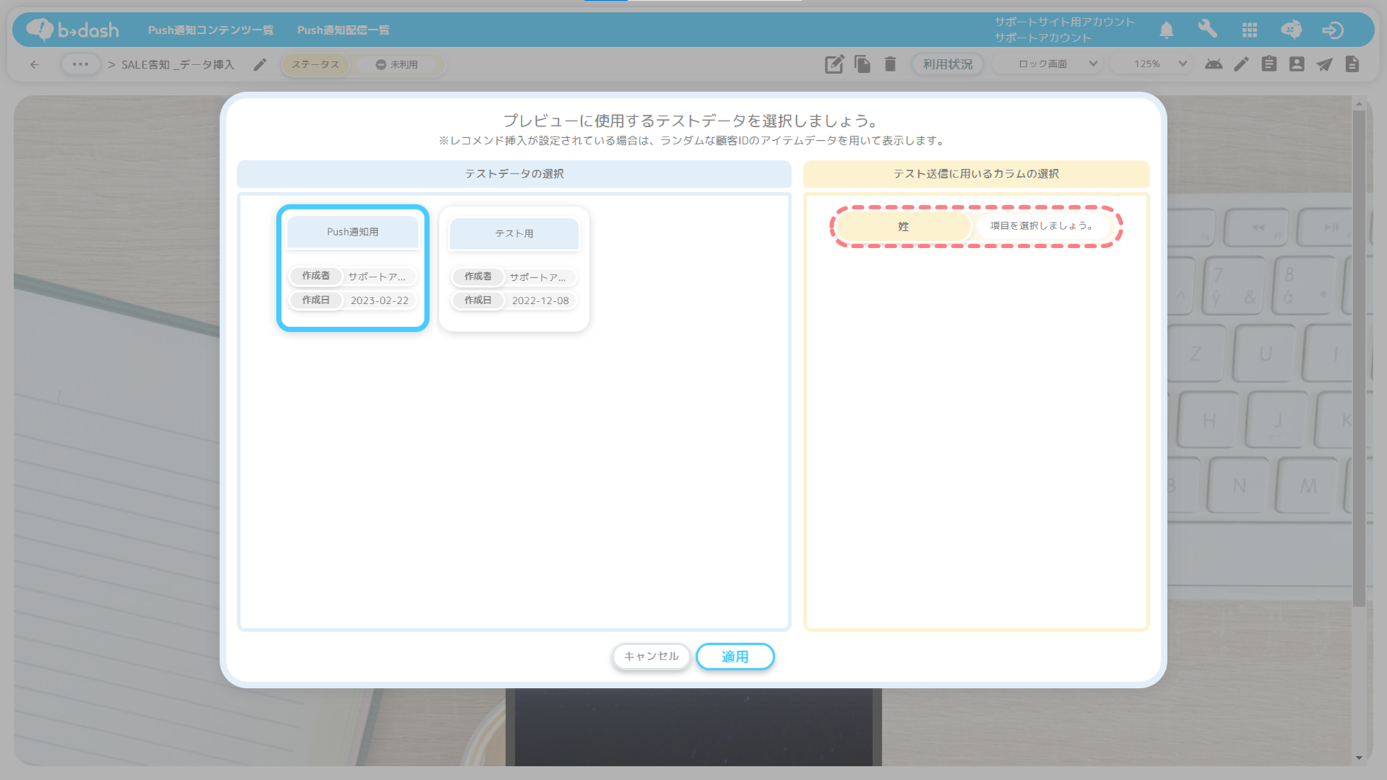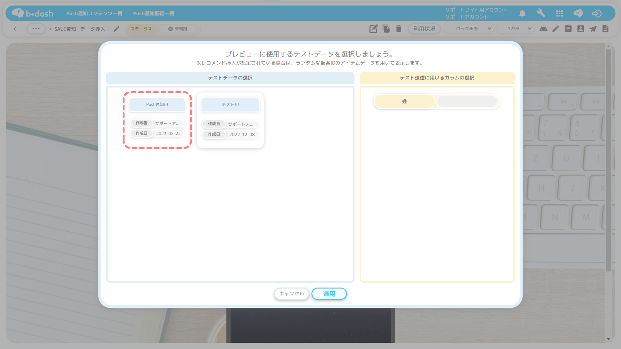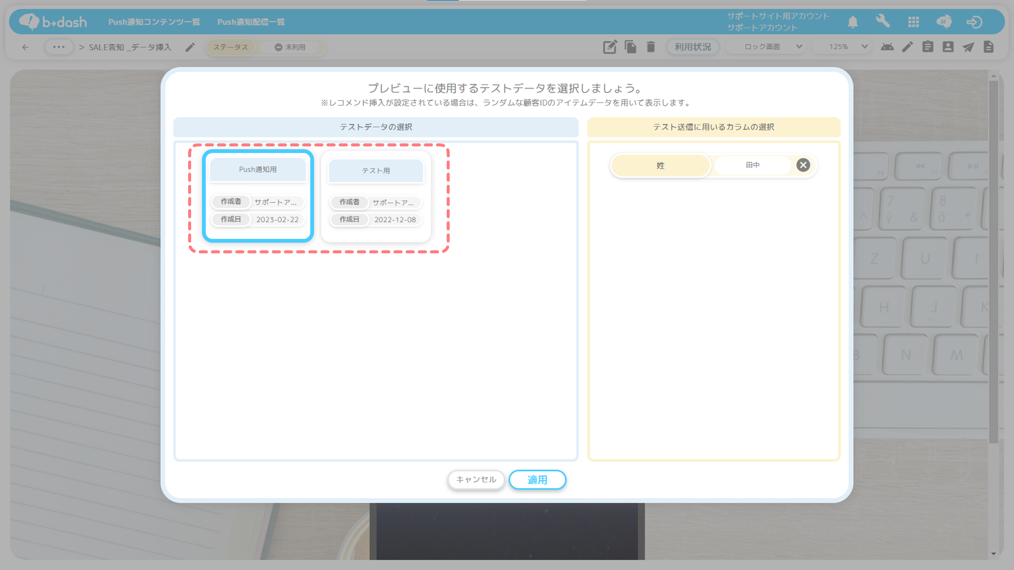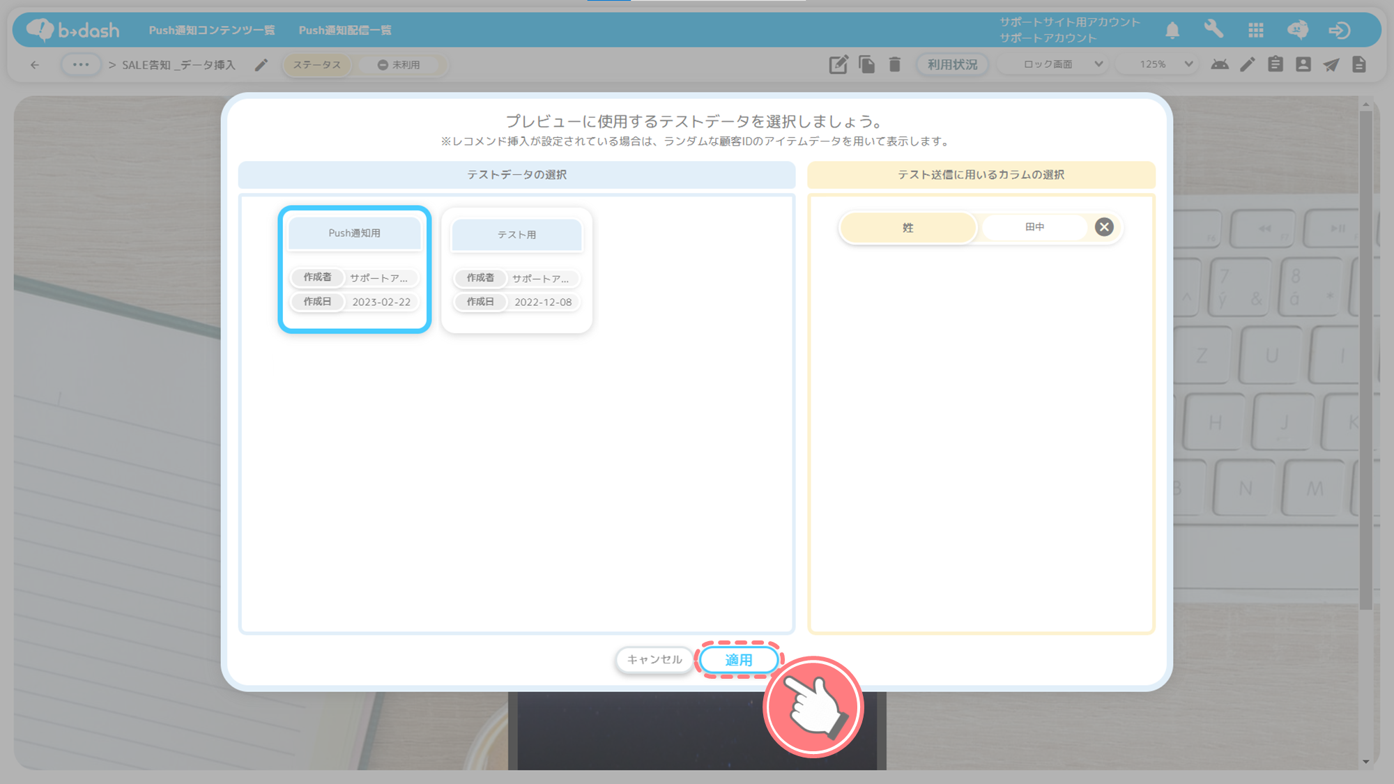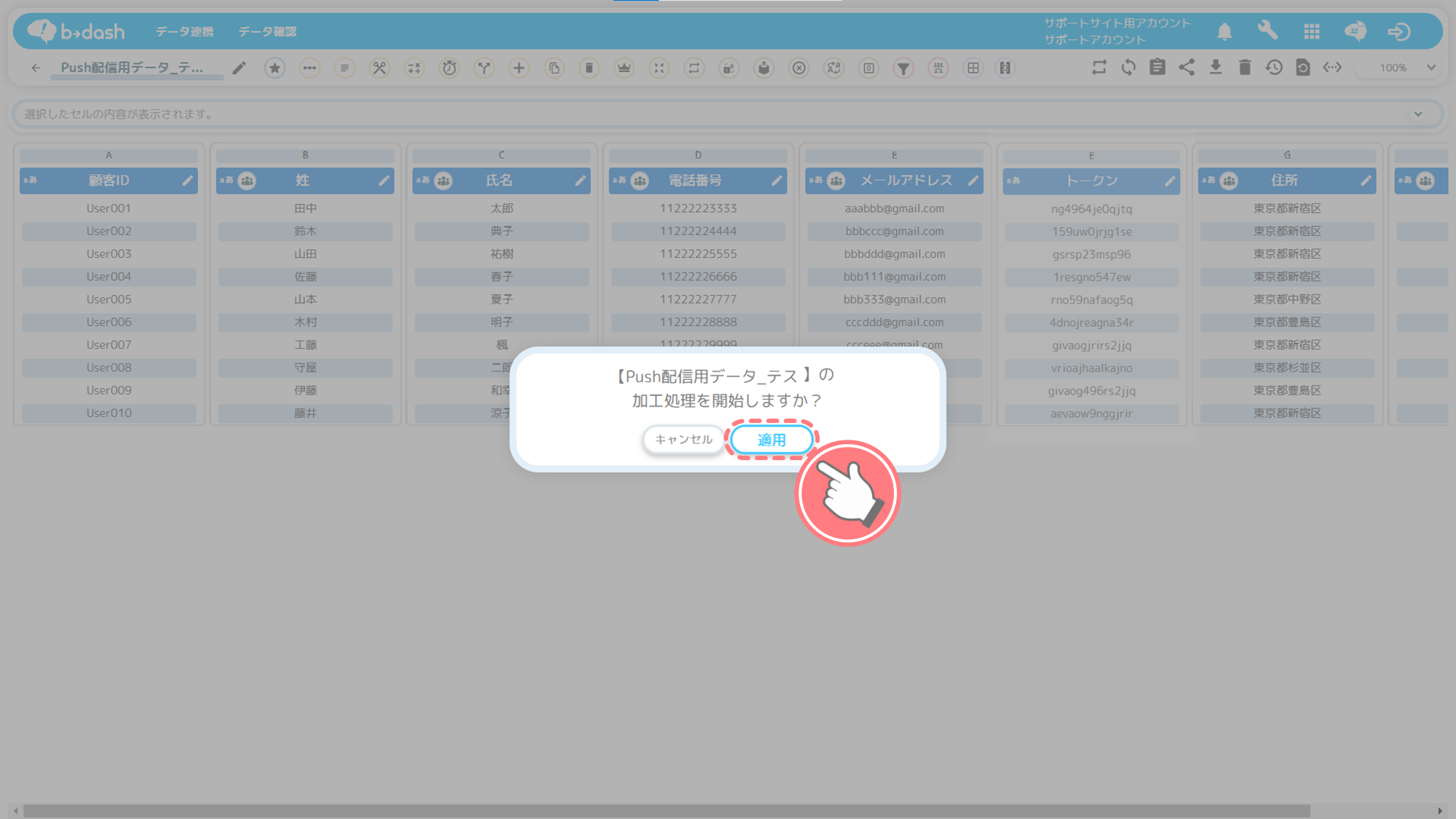 「テストデータ」として利用したいレコードの「顧客ID」を入力し、「適用」をクリックします
