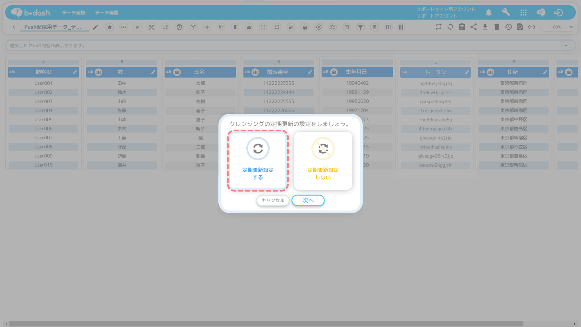 「テストデータ挿入」を設定していた場合、「テストデータを用いる」もしくは「指定した顧客IDのデータを用いる」のいずれかに『青色の枠』が表示されています。