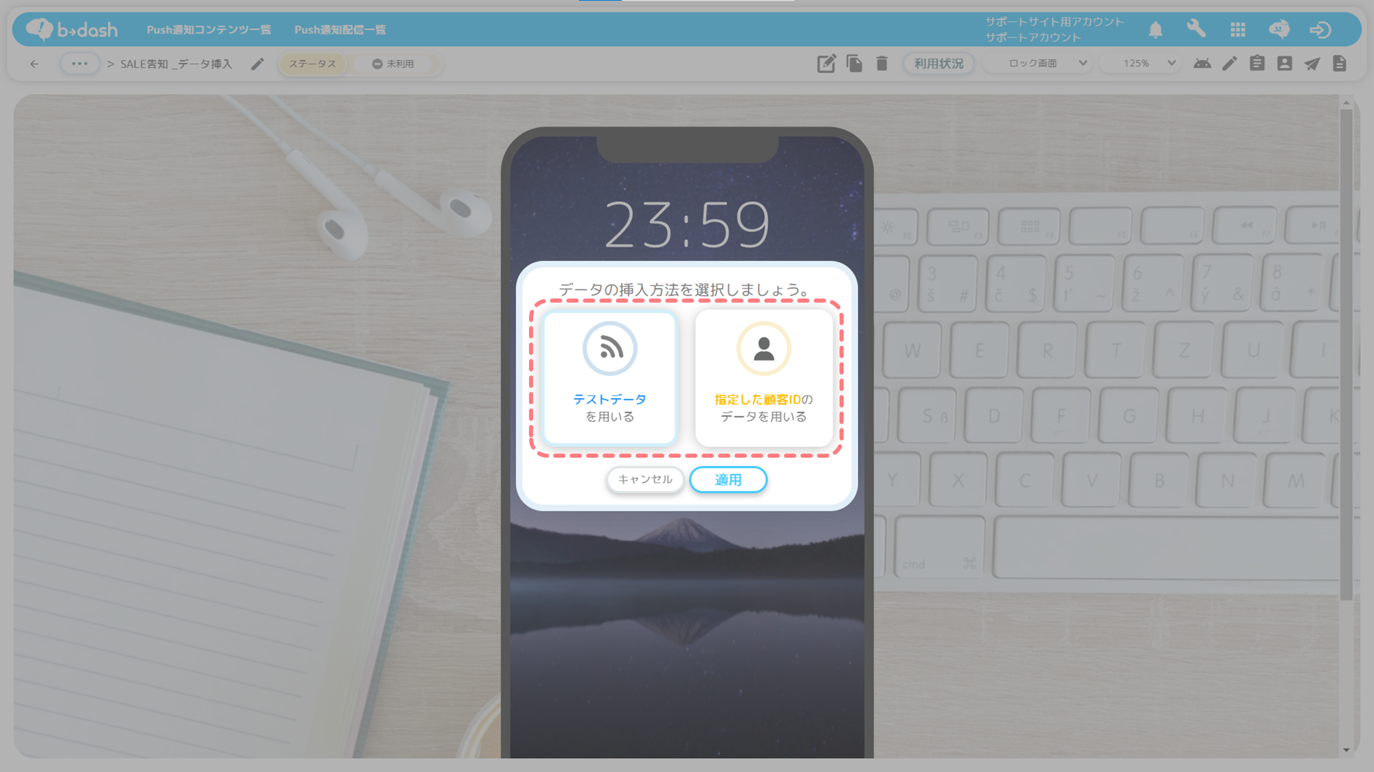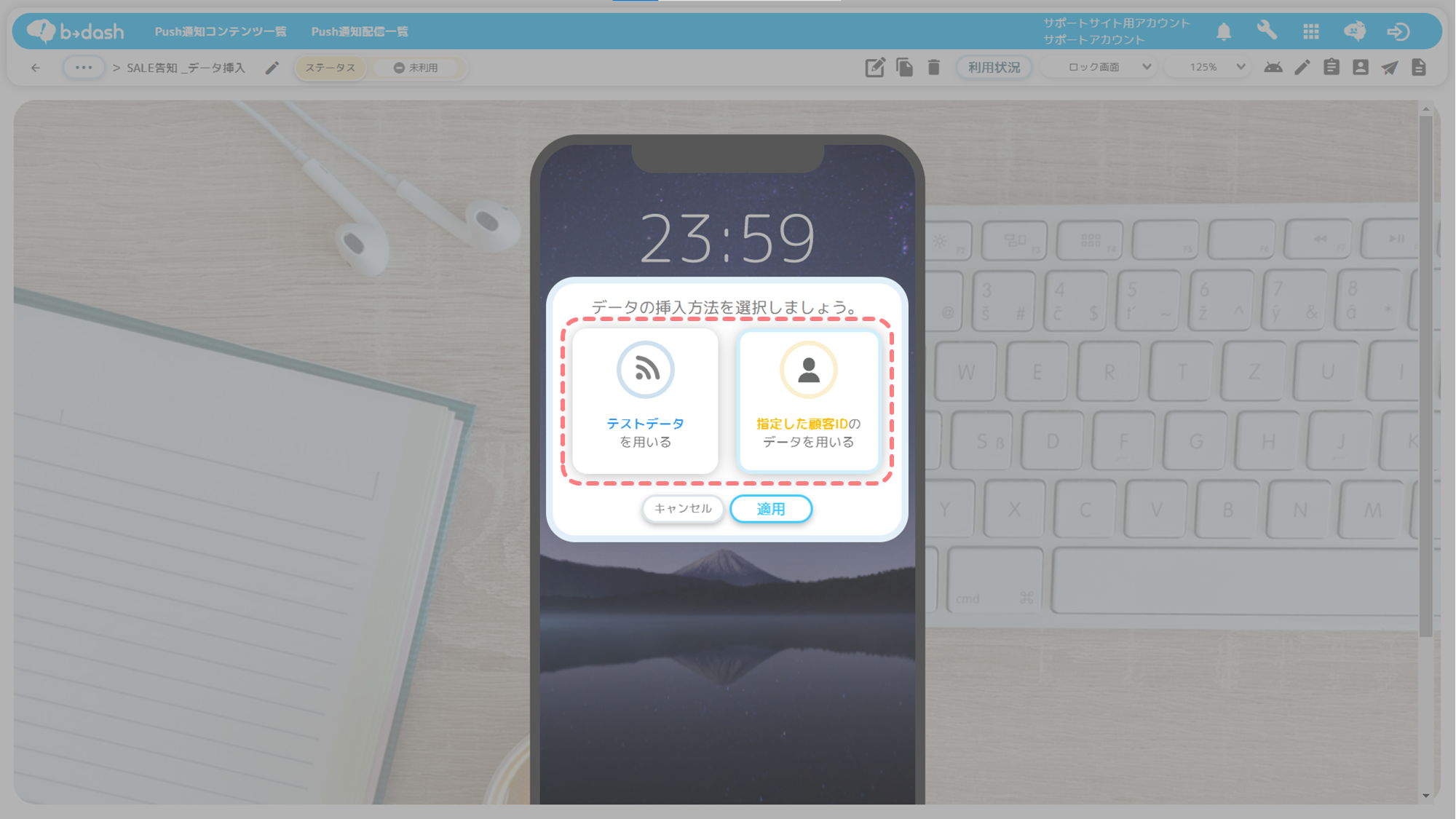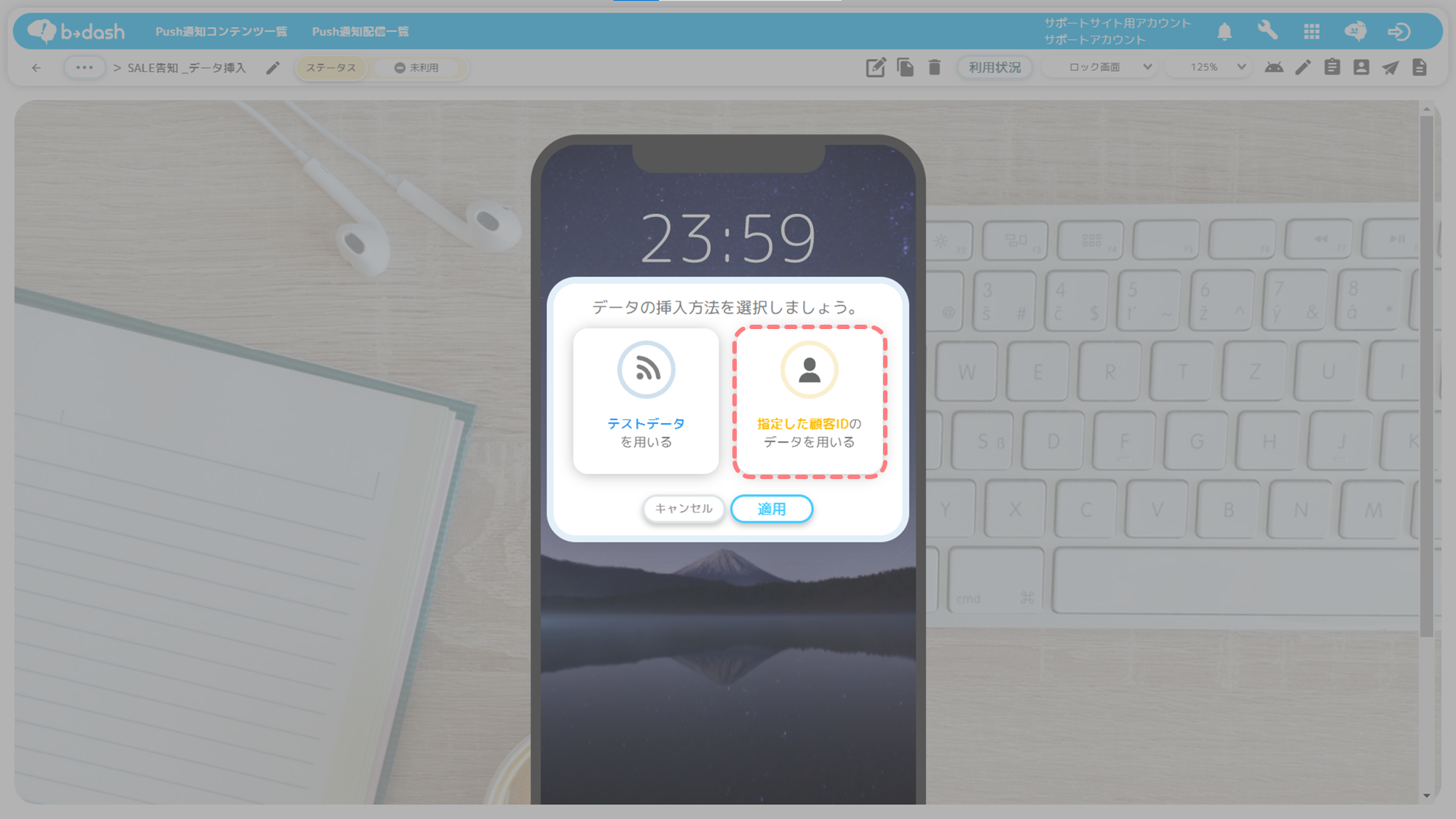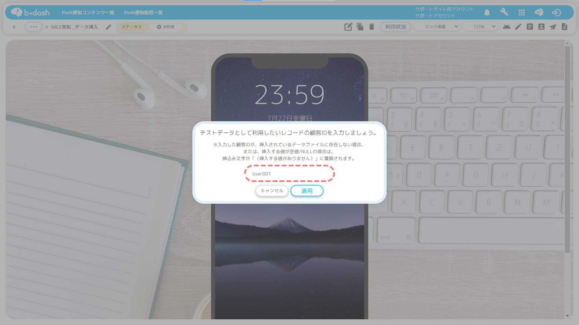 「データ挿入」に使用しているデータファイルに含まれる顧客ID」を入力し、「適用」をクリックします