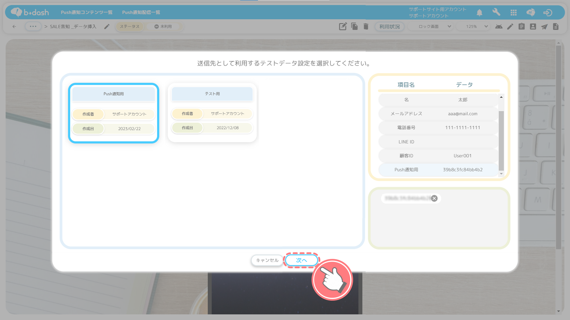 「テスト送信に用いるカラムの選択」で指定したカラムに該当するデータを選択し