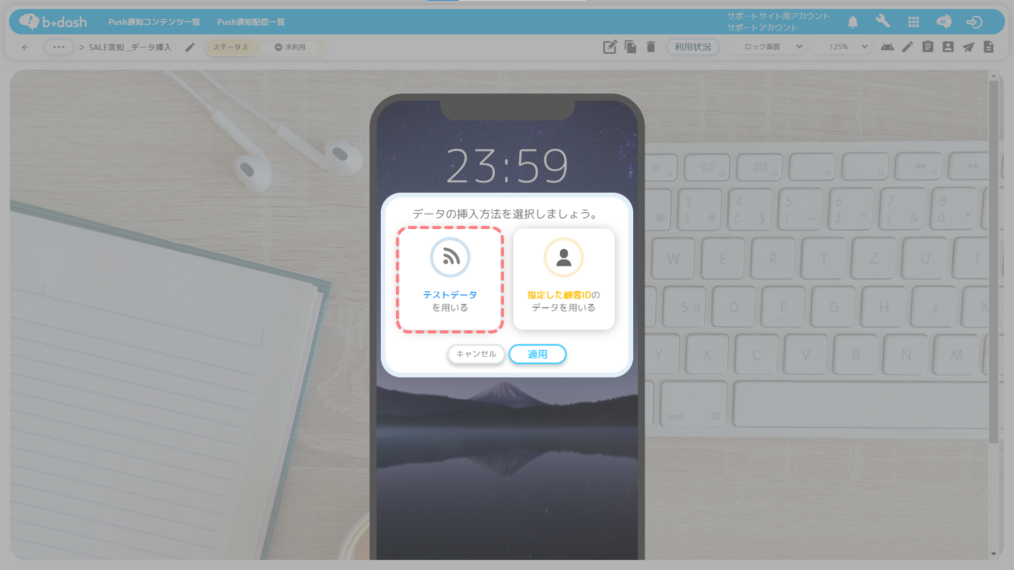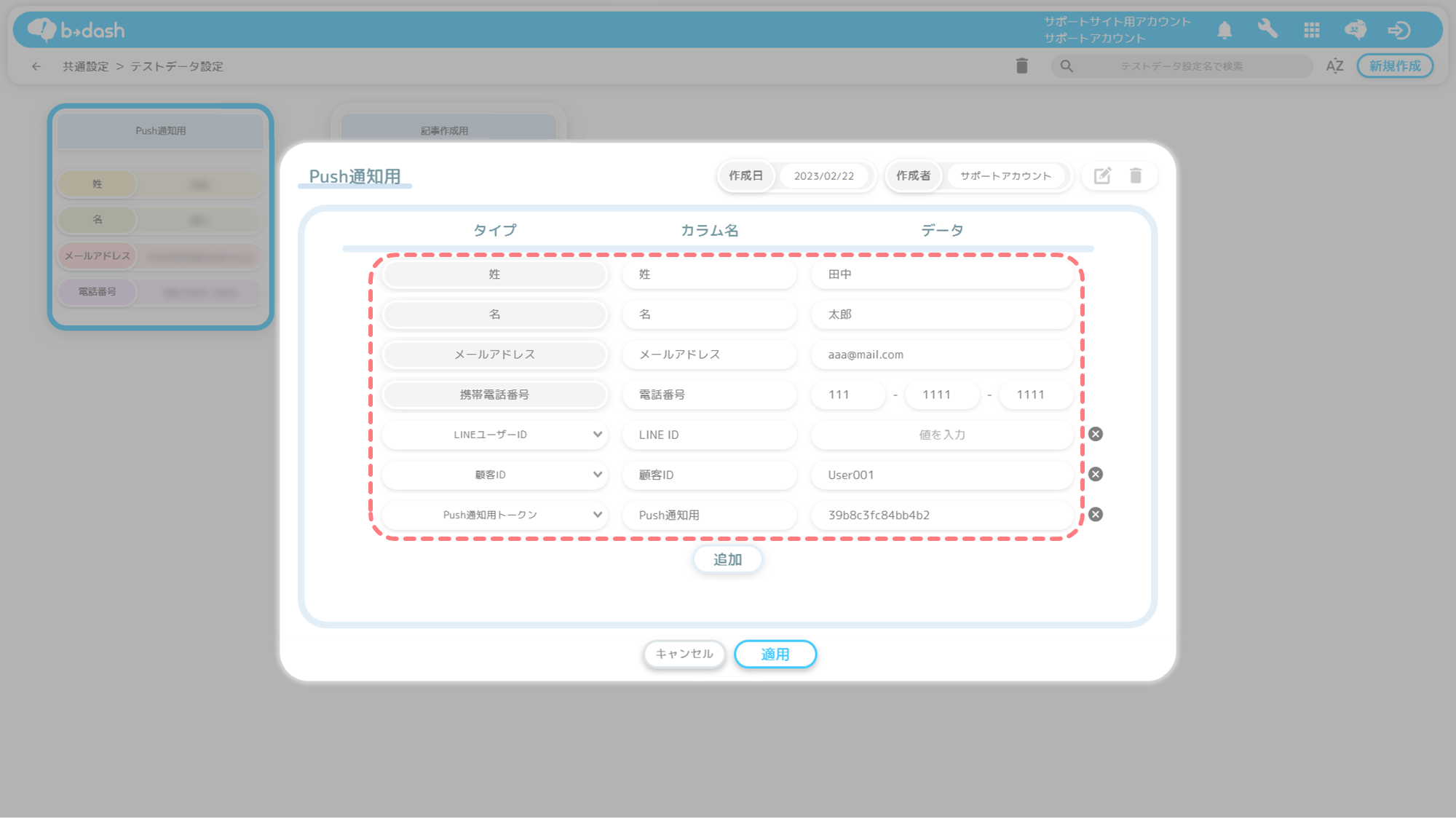 テストデータ設定」の内容を変更し、「適用」をクリックします