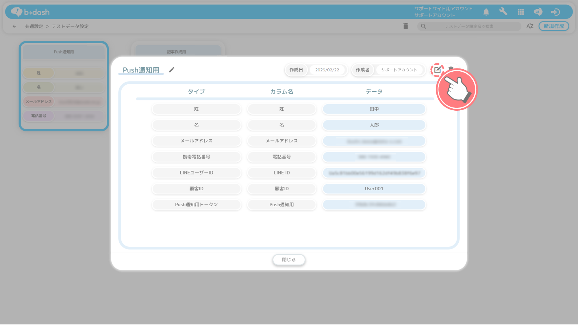 「テスト送信」の際に選択した「テストデータ」をクリックします