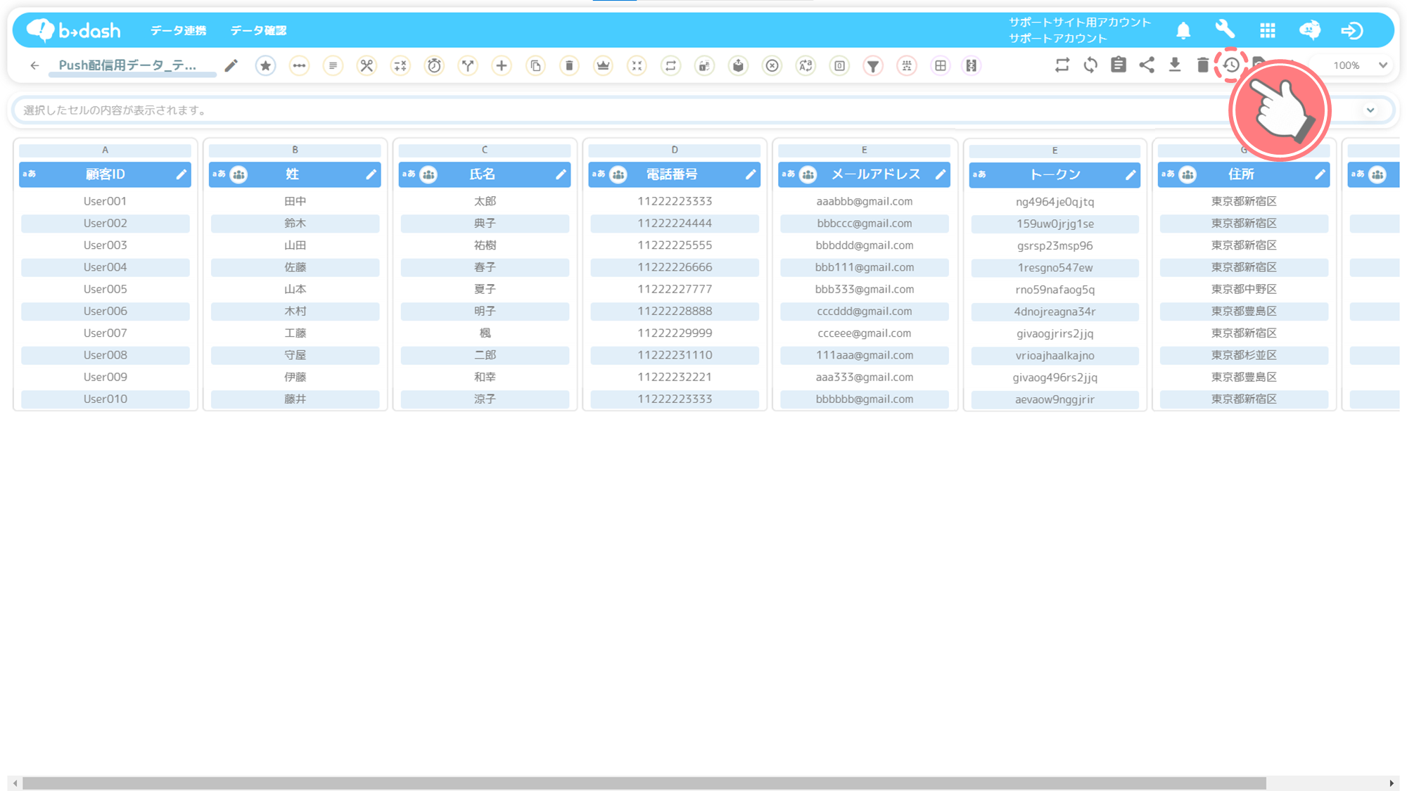 データ挿入」に使用しているデータファイルを開き、「処理実行履歴」をクリックします