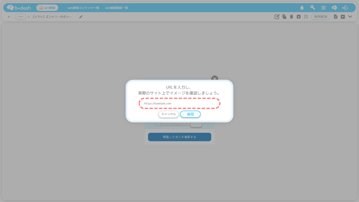テスト配信の方法については「web接客をテスト配信する方法を知りたい(テスト配信ページを用意できない場合)」をご参照ください。
