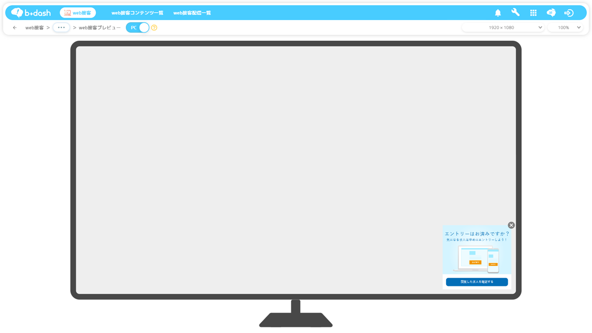 PC画面におけるプレビューでは、配信設定で指定した表示位置にかかわらず、web接客は画面の「右下」に表示されます。