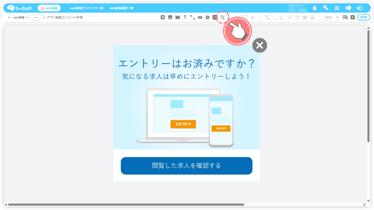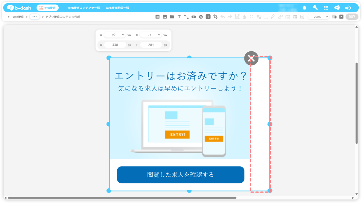 「閉じるボタン」の枠をドラッグ&ドロップして、任意のサイズに変更します