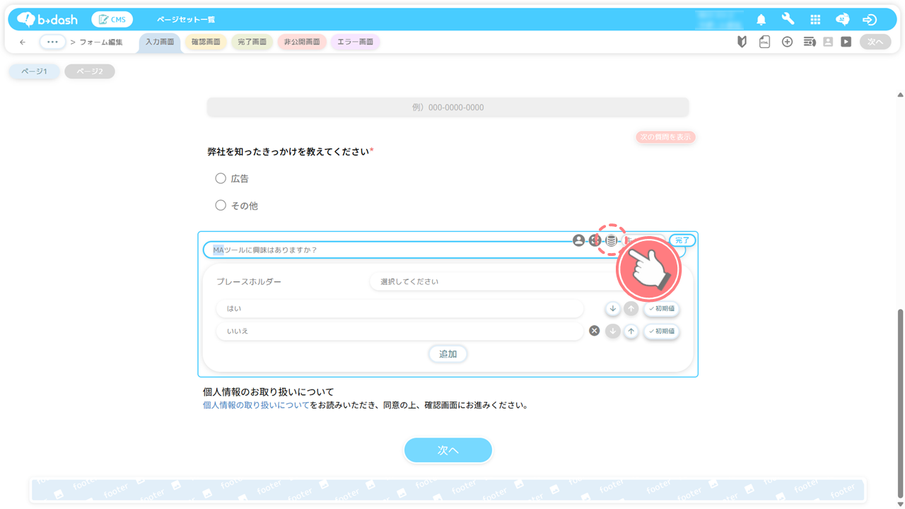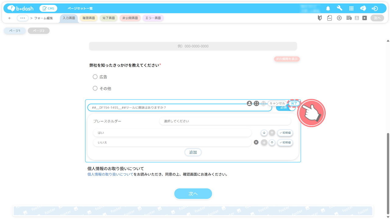 質問名の編集と任意の設定を行い、「完了」をクリックします