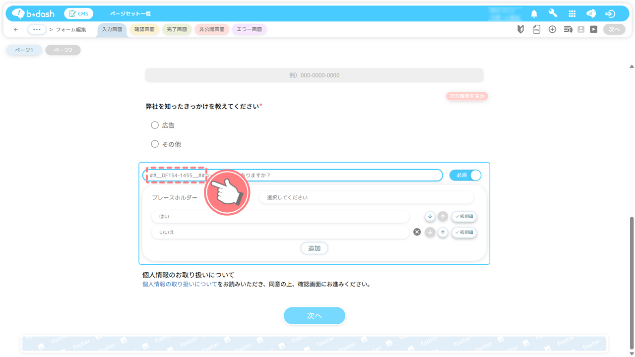 | プレースホルダー設定 | 入力項目に対して、入力に関するヒントを示すテキストを表示する設定 |