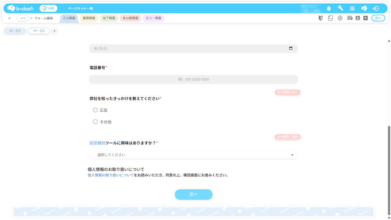 b→dashのテンプレートを利用された場合のみ、ユーザーのモバイル端末の環境に応じて、「フォームの幅」や「画像の大きさ」を自動で調整するレスポンシブ対応を適用しています。