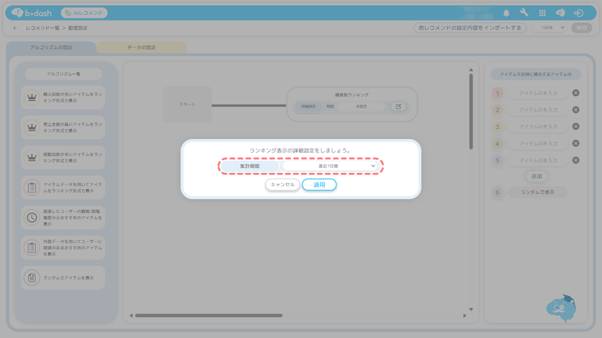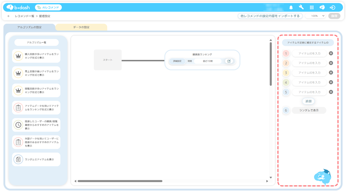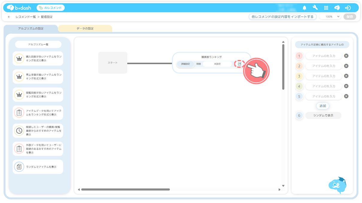 ❶ アルゴリズムの選択 ・・・AIレコメンドに使用するアルゴリズムの選択を行います